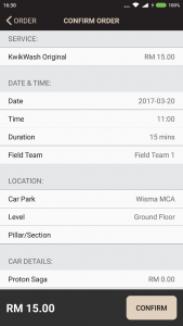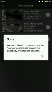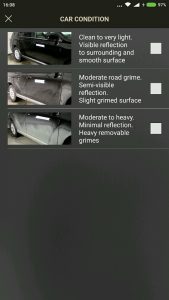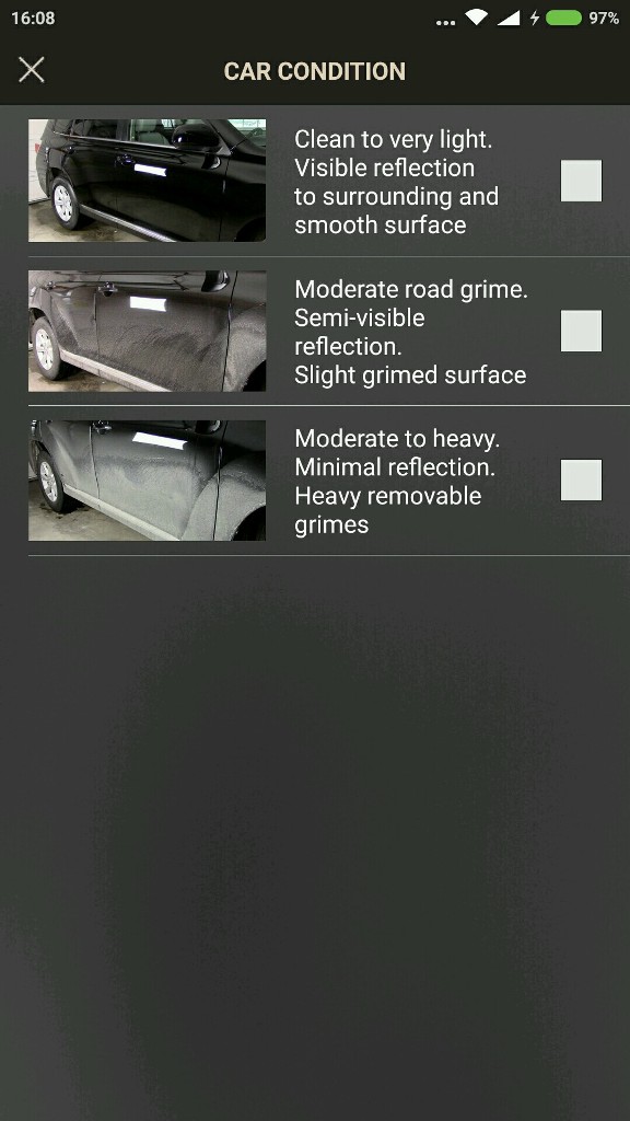 Ada 3 kondisi perlu dipilih berdasarkan tahap kekotoran kereta anda sama ada biasa (clean), sederhana (acceptable) atau kotor. Pilihlah salah satu. Daripada cubaan kami menggunakan tiga kawasan parkir berbeza, KwikWash setakat ini tidak menyediakan perkhidmatan cucian untuk kereta tahap kotor, cuma kondisi biasa dan sederhana saja.