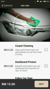 Menu ini akan menyenaraikan pilihan cucian tambahan untuk dipilih. Bagi pakej Original ada 6 jenis pilihan cucian tambahan seperti cucian karpet, perlindungan papan pemuka, cucian kerusi fabrik, cucian kerusi kulit, hilangkan bau, rawatan cermin depan (lihat gambar atas kanan). Jika anda cuma mahu cucian biasa, tidak perlulah klik mana-mana butang pilihan. Terus saja tekan NEXT.