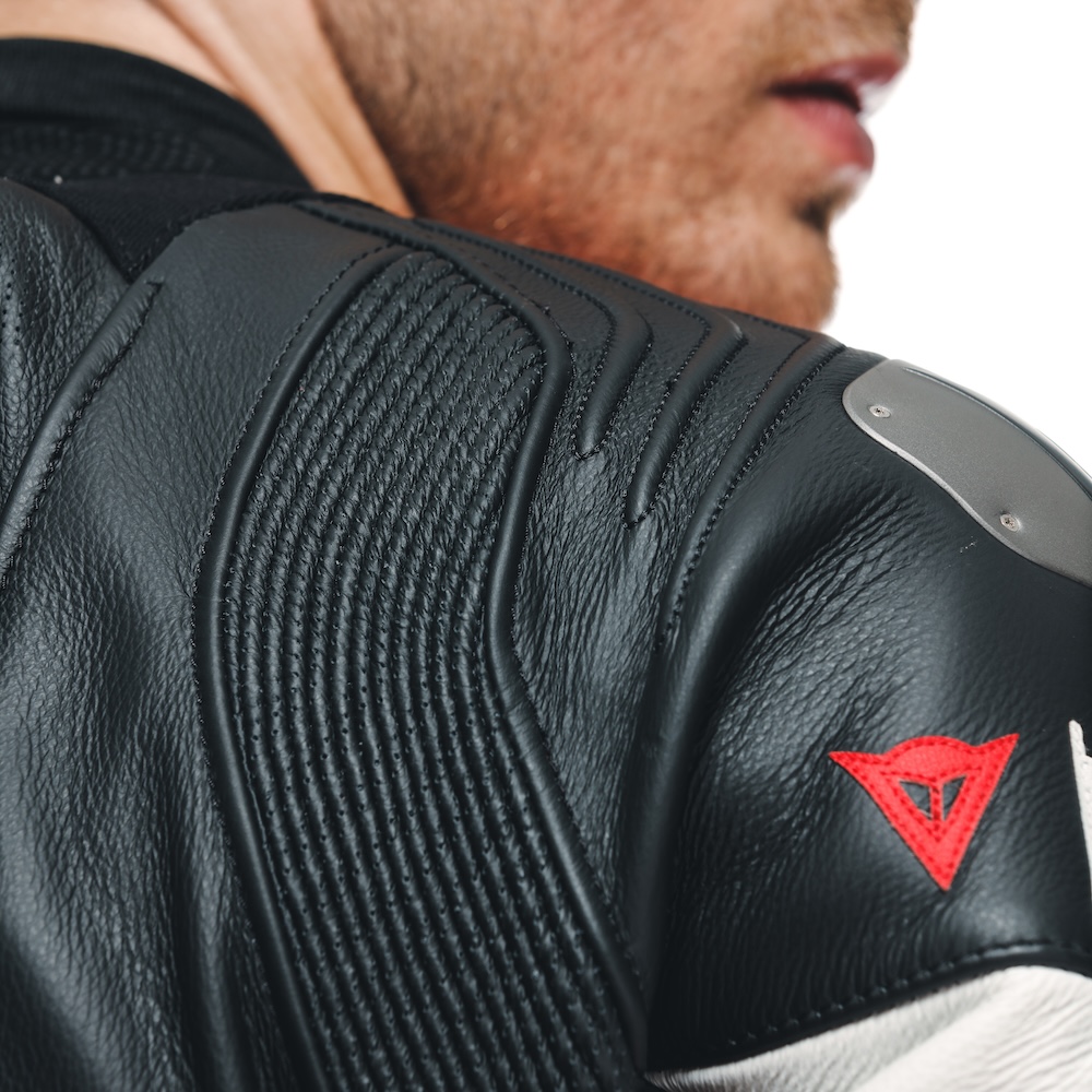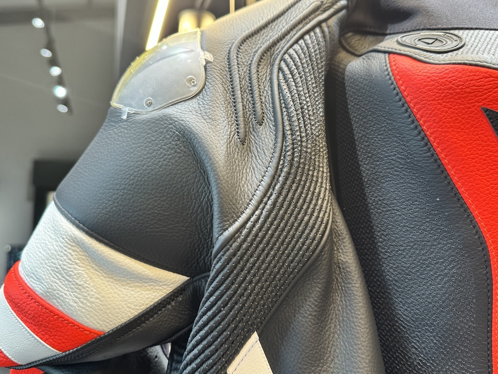 - Sut menggunakan material kulit asli (full grain) lembu D-Skin 2.0 jenis ringan untuk perlindungan maksimum dan keselamatan di trek lumba.