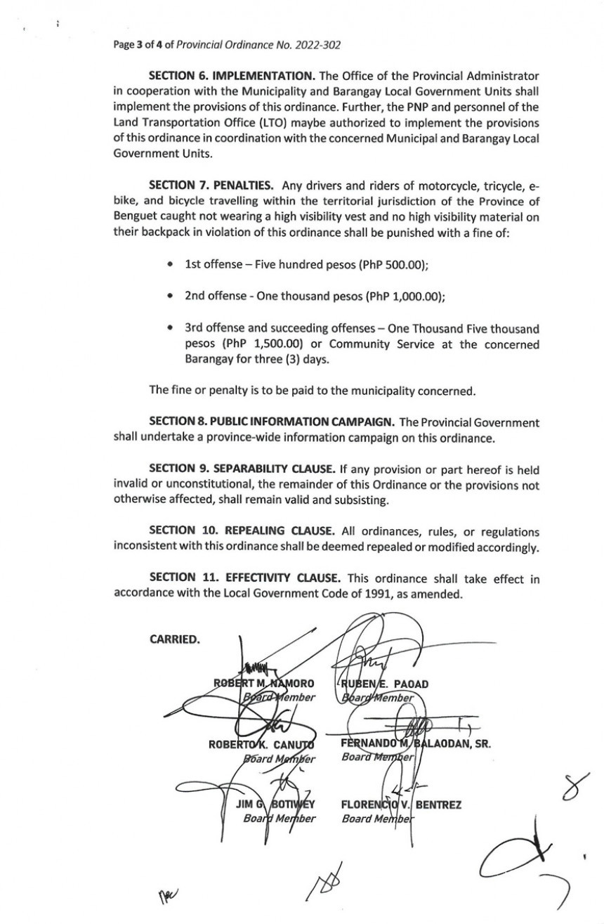 Ini disebabkan Wilayah Benguet (bandar Baguio terletak di dalamnya) sudah meluluskan Ordinan Wilayah No. 2022-302 yang mensyaratkan semua penunggang motosikal, basikal, basikal tiga roda dan basikal elektrik untuk memakai ves pemantul cahaya.