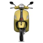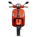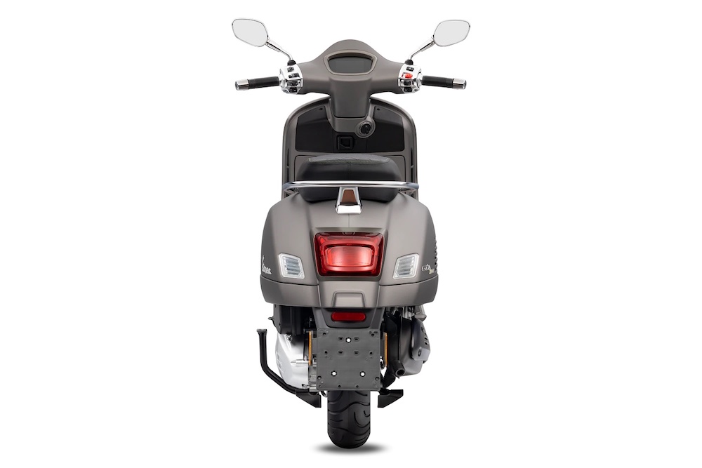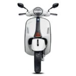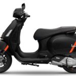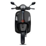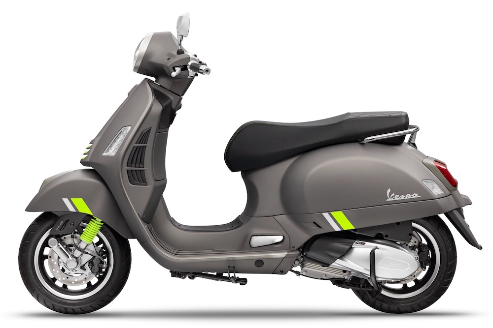 Ada hiasan corak gentian karbon pada bahagian depan Vespa, manakala pelana hitam mendapat sulaman benang jingga terang kembar.