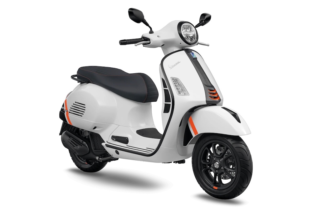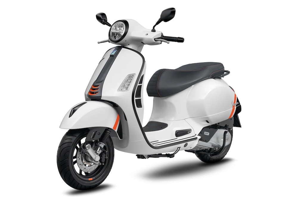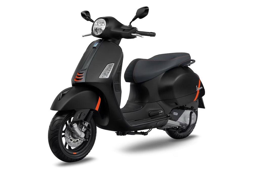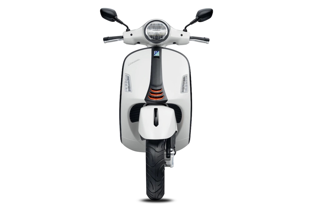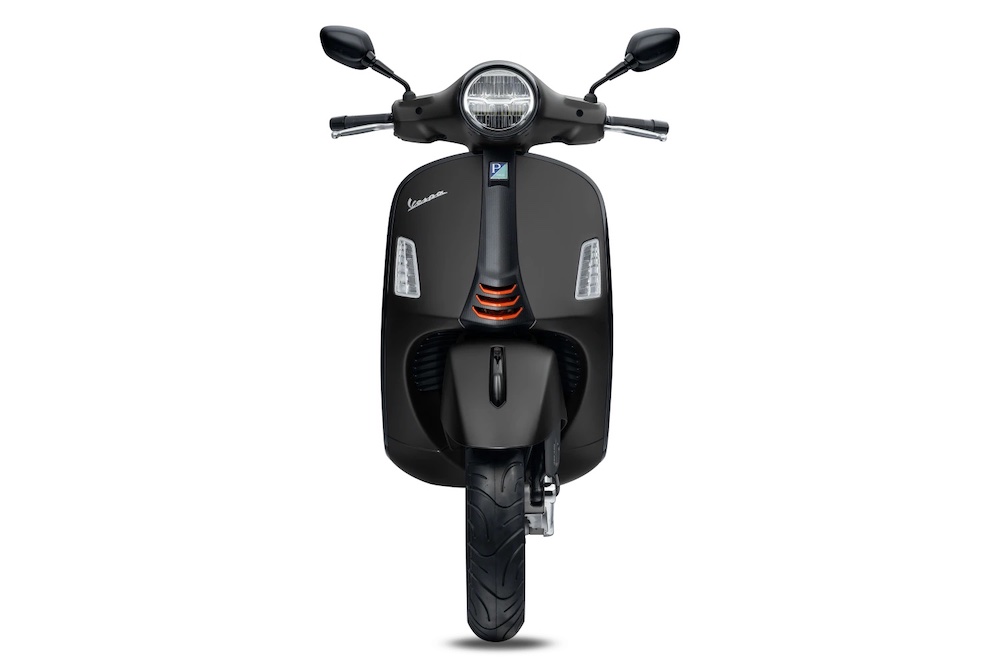 Ada hiasan corak gentian karbon pada bahagian depan Vespa, manakala pelana hitam mendapat sulaman benang jingga terang kembar.