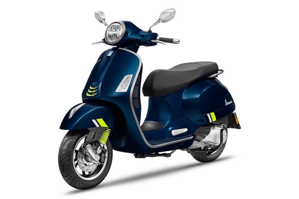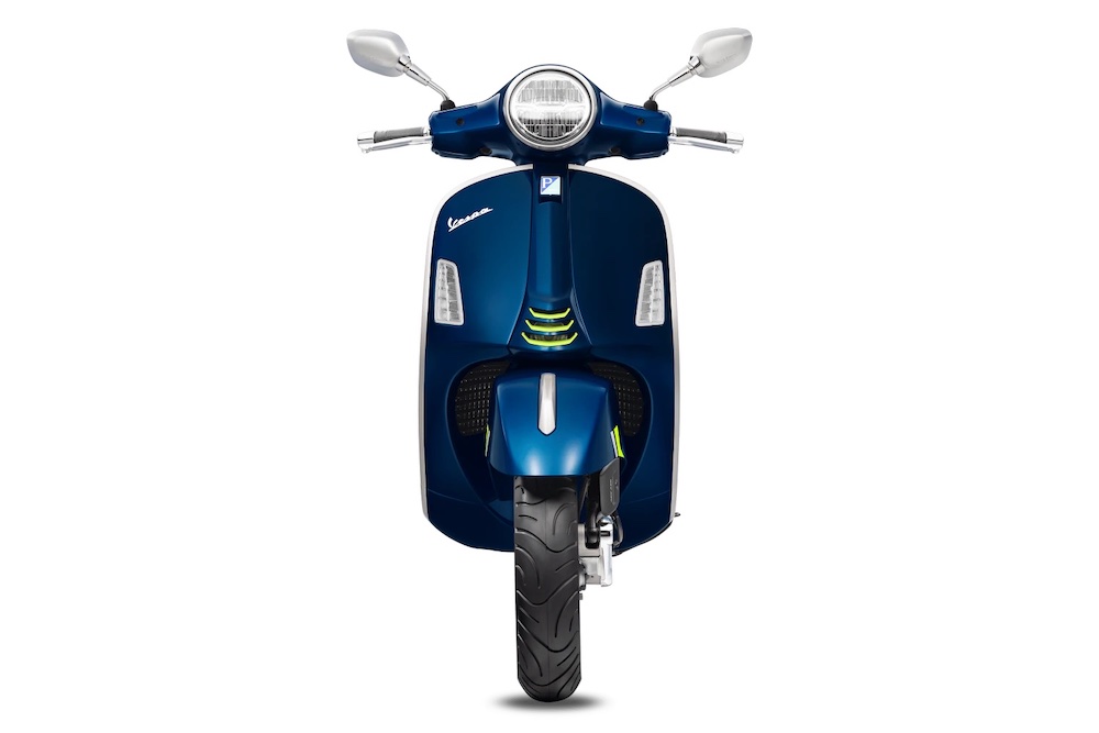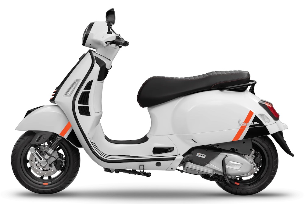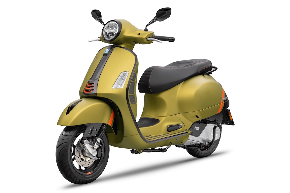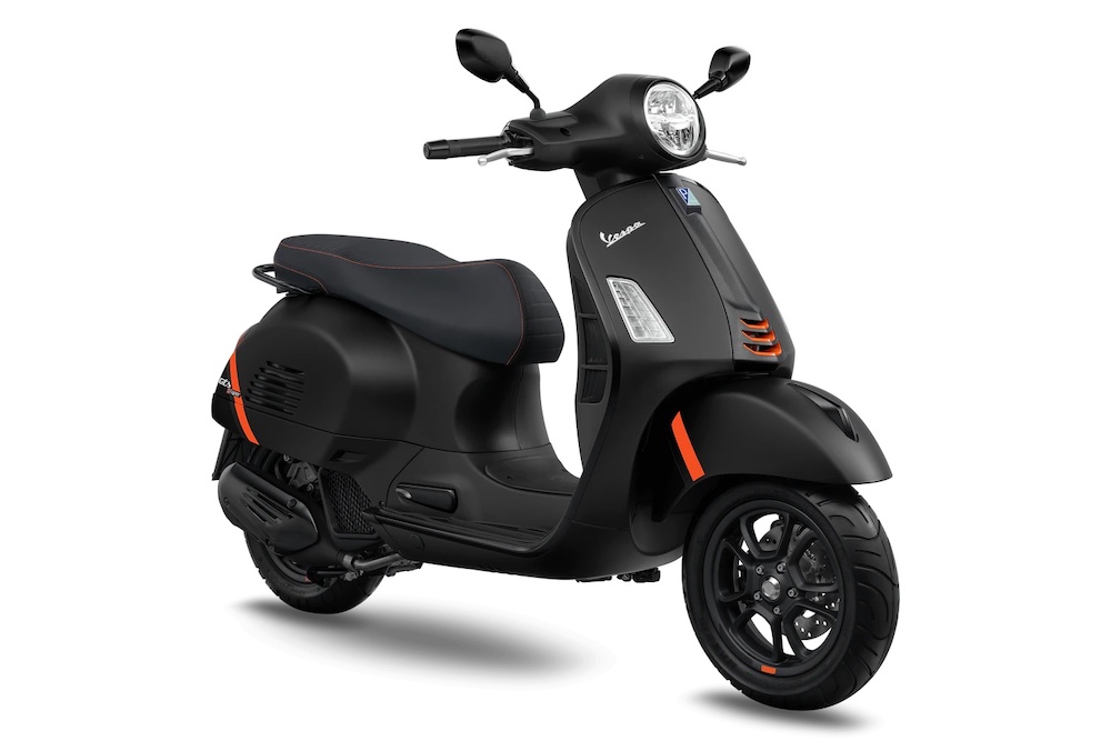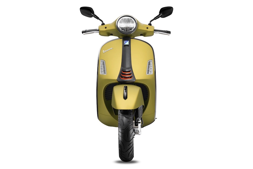Ada hiasan corak gentian karbon pada bahagian depan Vespa, manakala pelana hitam mendapat sulaman benang jingga terang kembar.