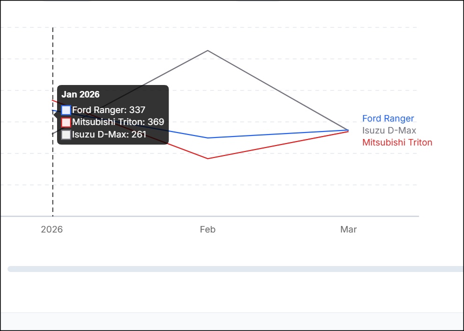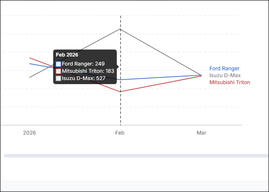 Pendaftaran Hilux pada Mac (1,749 unit) mencatatkan dua kali ganda lebih tinggi berbanding gabungan ketiga-tiga pesaing utama yang hanya 815 unit: