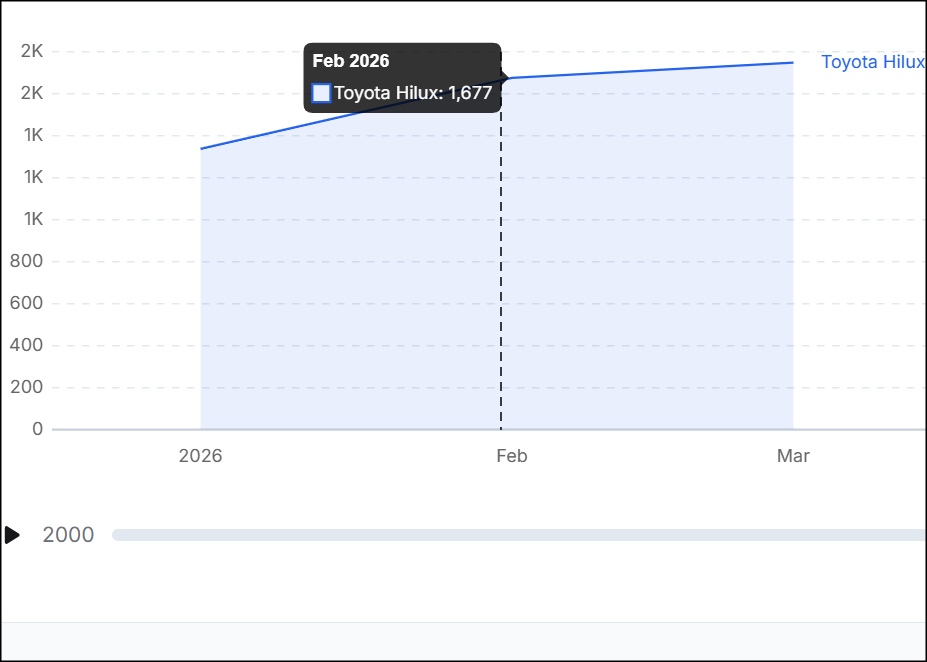 Bagaimanapun, pendaftaran pada Mac menyaksikan Hilux tersingkir dari kelompok elit apabila menduduki tangga ke-12 keseluruhan: