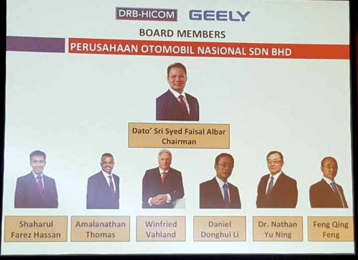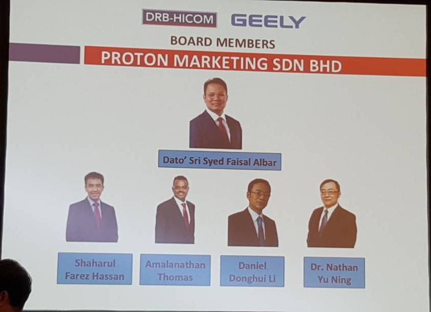 Sementara itu, Datuk Sri Syed Faisal Albar kekal sebagai Pengerusi Proton dan turut disertai ahli lembaga pengarah yang juga wakil DRB-HICOM, Shaharul Farez Hassan dan Amalanathan Thomas. Kedua-dua tokoh itu adalah sebahagian barisan pengurusan kanan dalam firma konglomerat Malaysia. Sementara itu, Geely Holding pula mencalonkan Daniel Donghui Li dan Feng Qing Feng untuk menyertai ahli lembaga pengarah Proton.