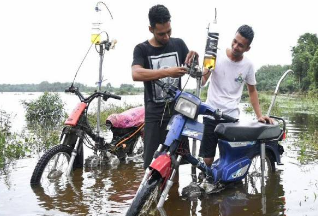 Ikram Shahidi Mat Kail dan adiknya Muhammad Zakaria bergabung tenaga mengubah suai botol plastik bagi menggantikan tangki minyak, karburetor dan saluran udara ke karburetor, hujung paip ekzos yang setiap satu diletakkan lebih tinggi dari aras biasa supaya boleh ditunggang melepasi paras banjir.