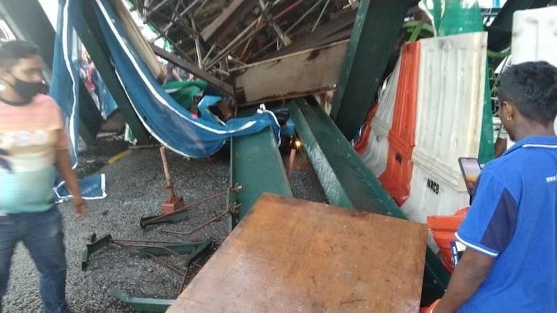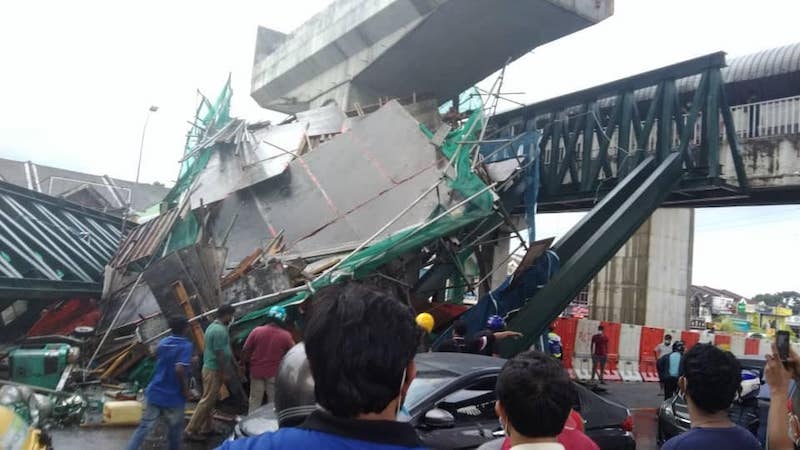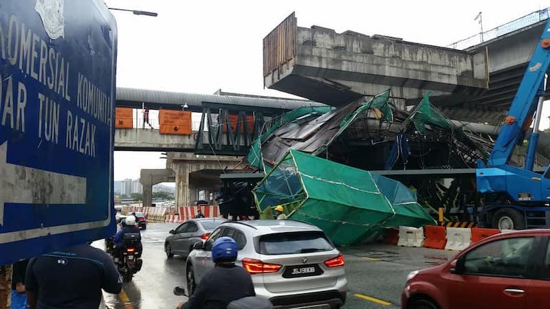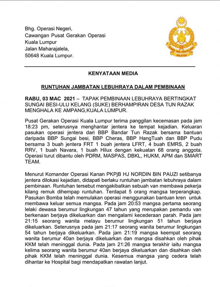 Polis mengesahkan menerima maklumat awal mengenai sebuah treler membawa jengkaut melanggar struktur binaan SUKE berhadapan Terminal Bersepadu Selatan (TBS). Impak rempuhan itu dipercayai menyebabkan berlaku runtuhan dan menghempap van tersebut.