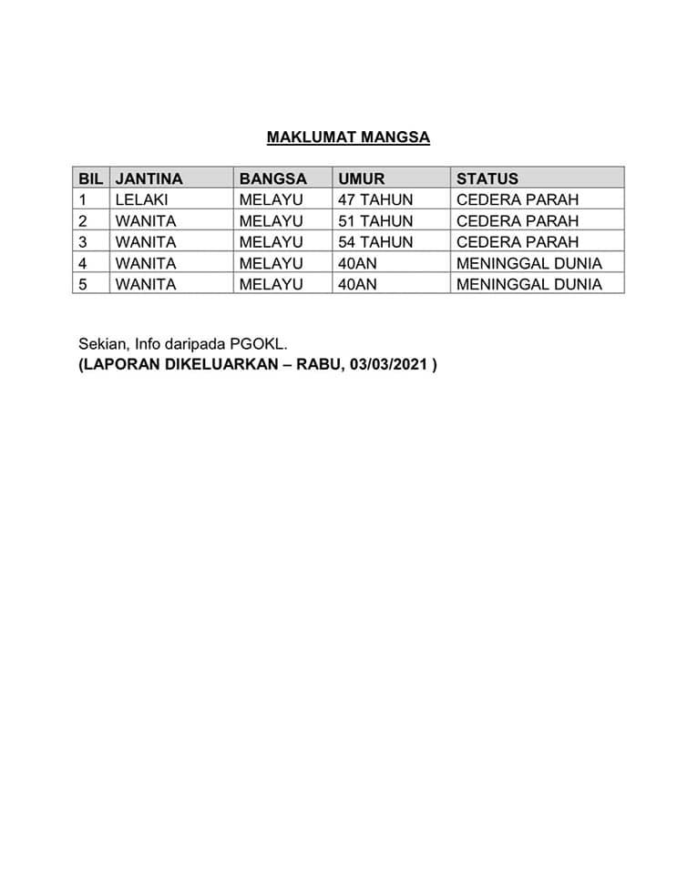 - Mangsa 5 – Wanita, 40-an, dikeluarkan 9.26 malam, meninggal dunia