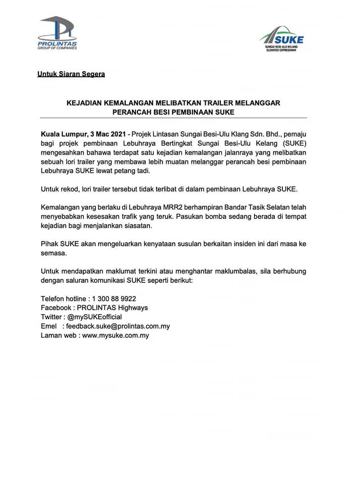 Pihak syarikat juga mengesahkan treler itu tidak terlibat dalam pembinaan Lebuhraya SUKE. Kemalangan disahkan berlaku dekat Bandar Tasik Selatan yang menyebabkan kesesakan teruk kedua-dua arah.