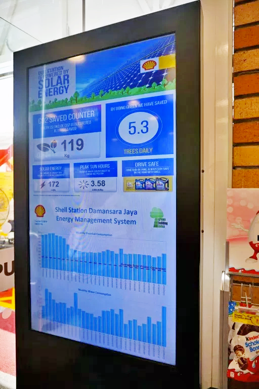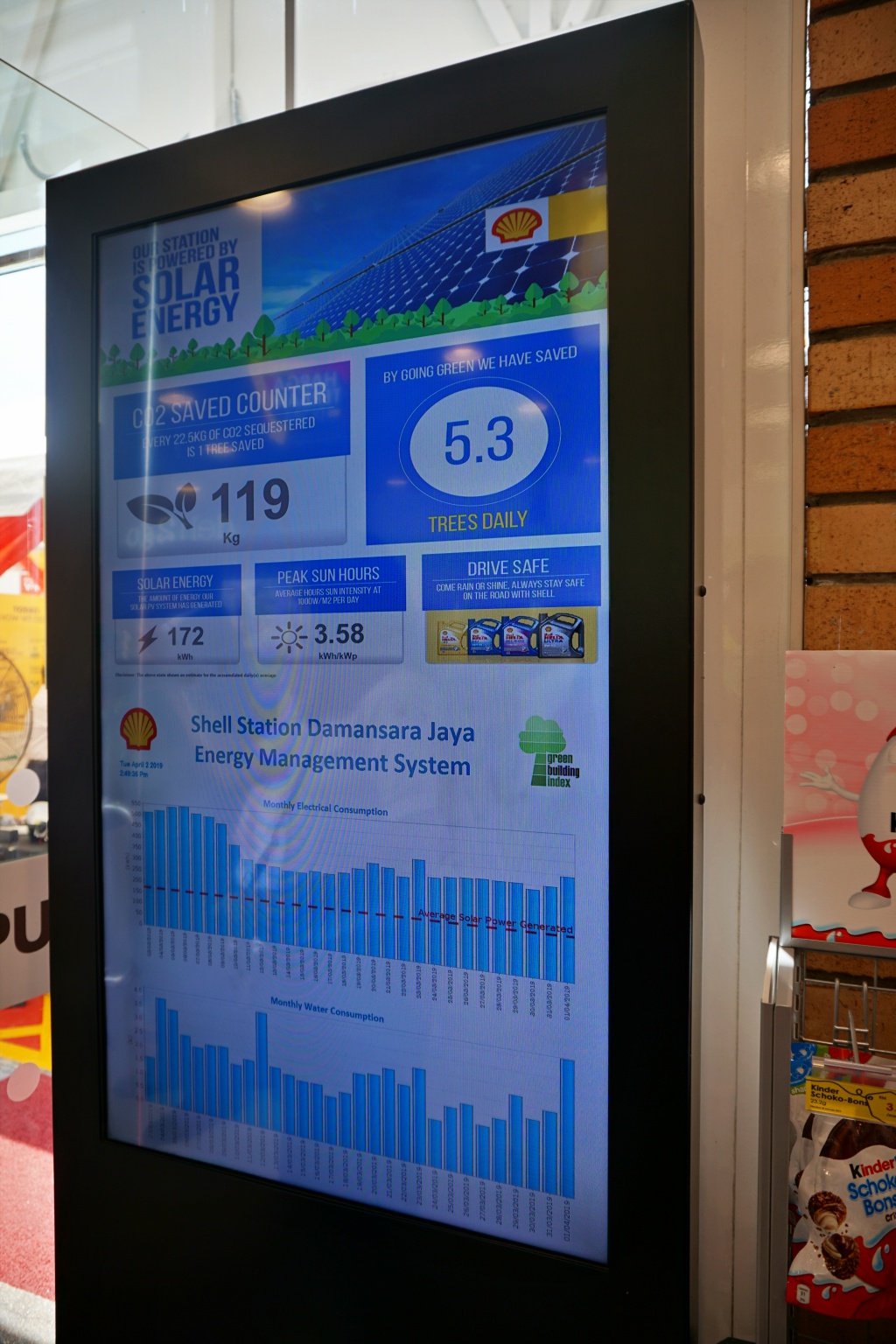 - Papan info elektronik di pintu masuk kedai runcit memaparkan maklumat tentang penggunaan tenaga, air, suhu dan pengurangan karbon bagi menggalakkan inisiatif hijau.