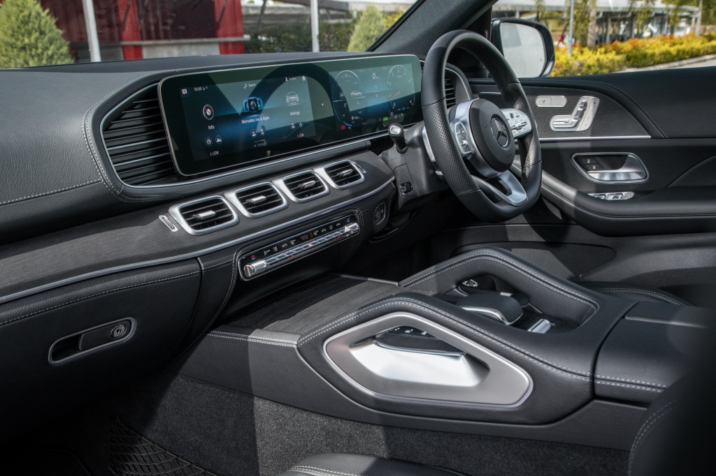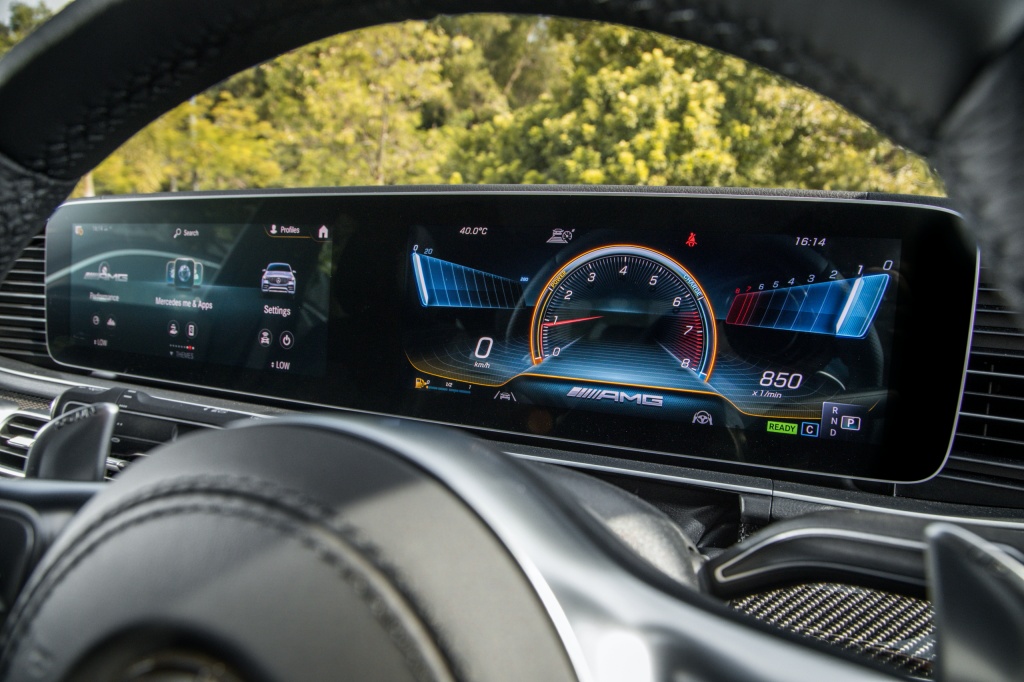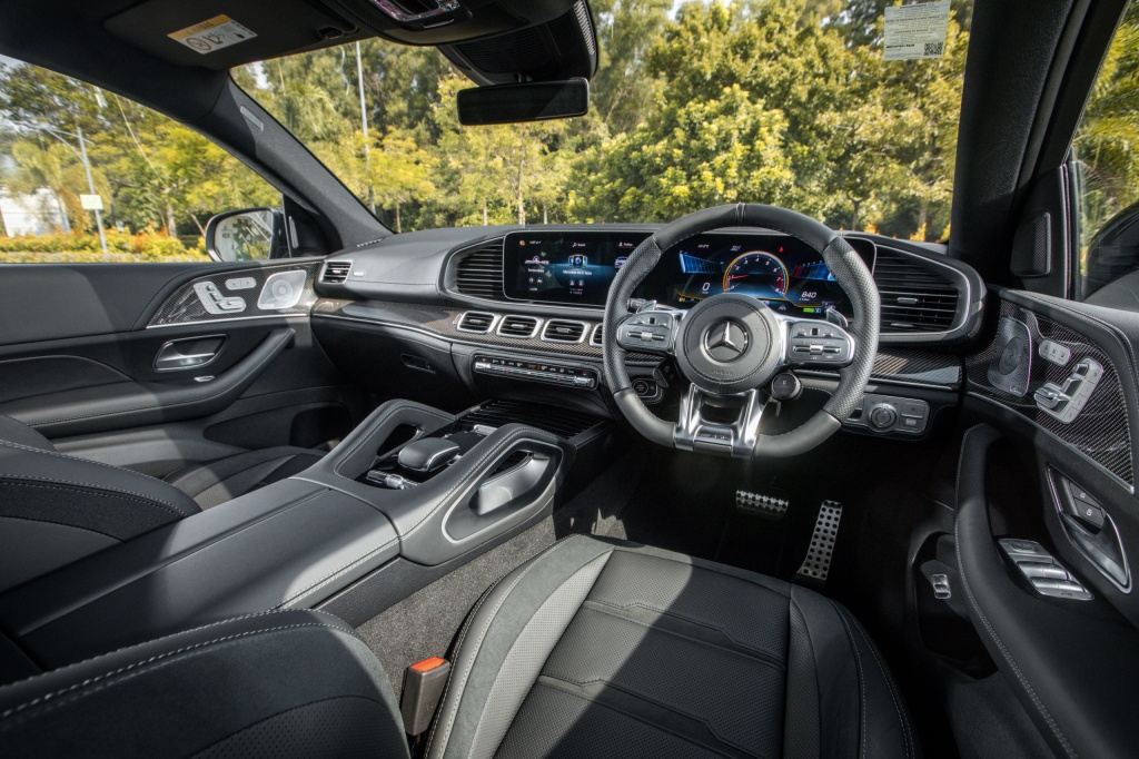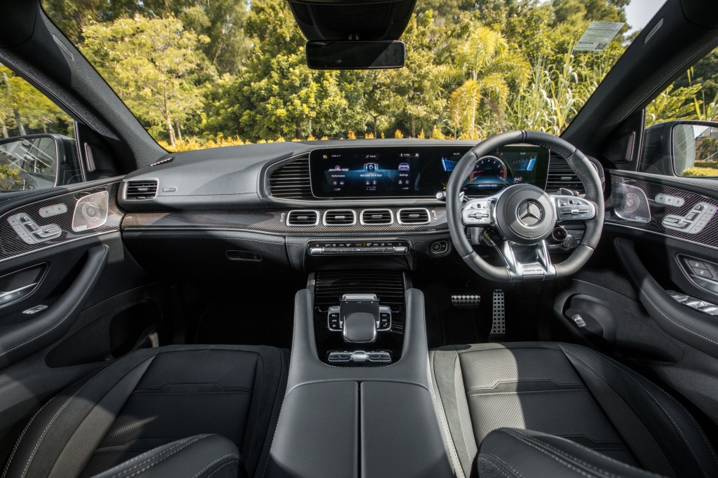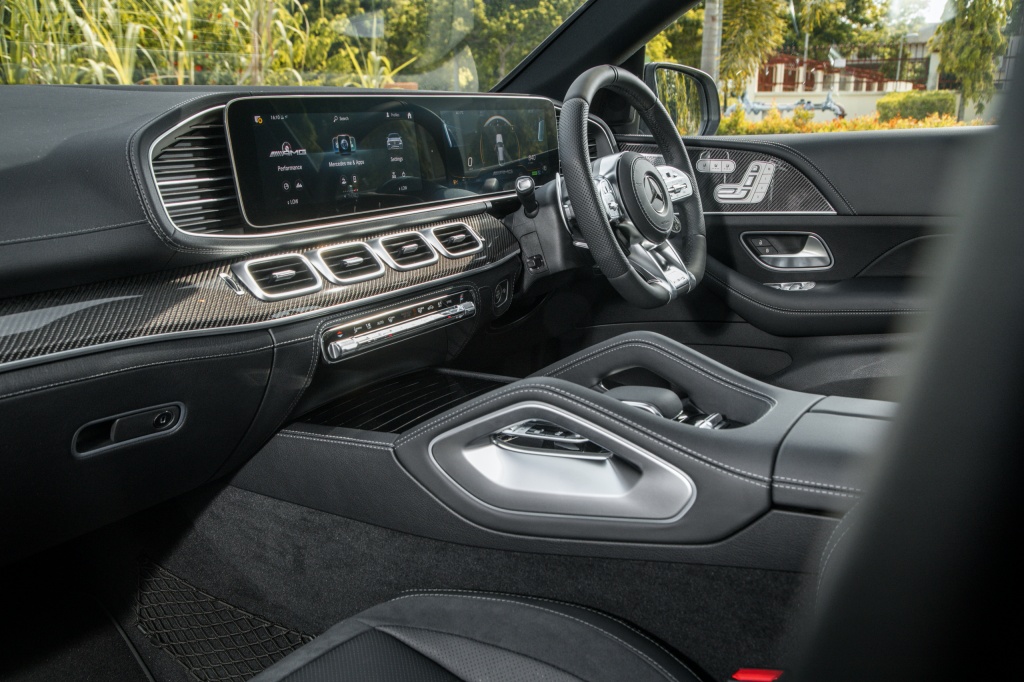 - Masuk ke kabin dihidangkan dengan skrin kembar 12.3 inci MBUX, sistem audio premium Burmester, ciri konektiviri Android Auto dan Apple CarPlay, paparan dongak (HUD), port pengecas wayarles, pakej Air Balance, pencahayaan ambien, trim gentian karbon AMG, karpet AMG, pakej AMG Line, stereng AMG kulit nappa, panel sil AMG iluminasi, kerusi boleh laras elektrik dengan fungsi memori dan kawalan iklim Thermotronic.