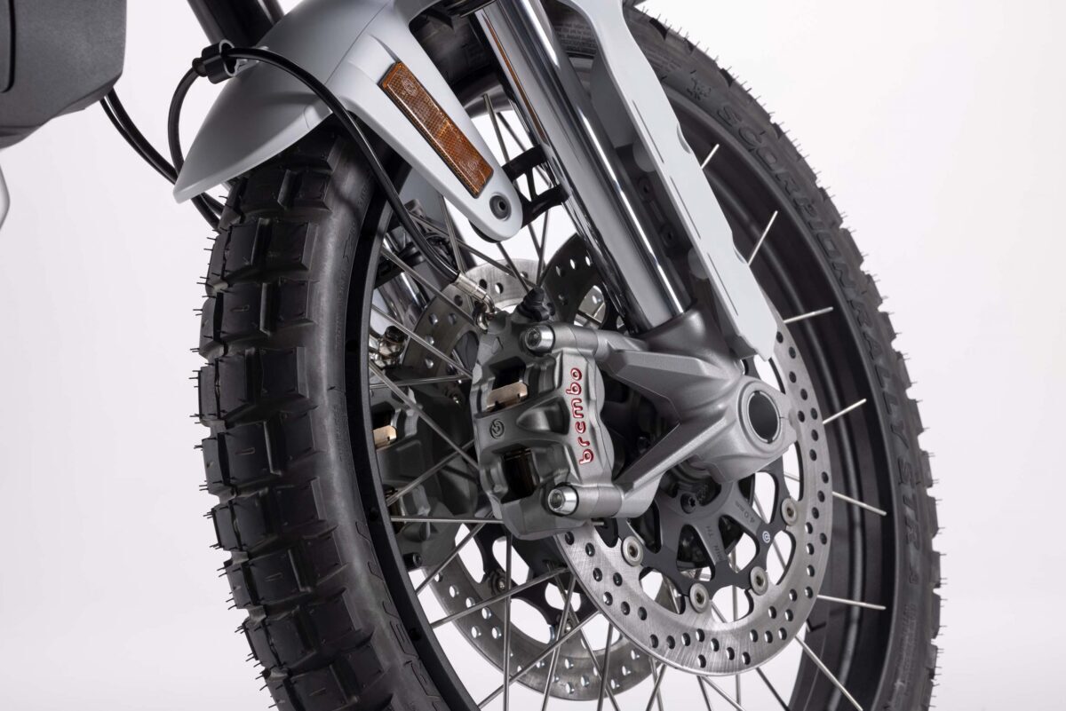 - Sistem brek depan menggunakan kaliper Brembo monoblok M50, dan dipadankan Sistem ABS selekoh (ABS Cornering) boleh tutup dalam mod Enduro dan Rally.