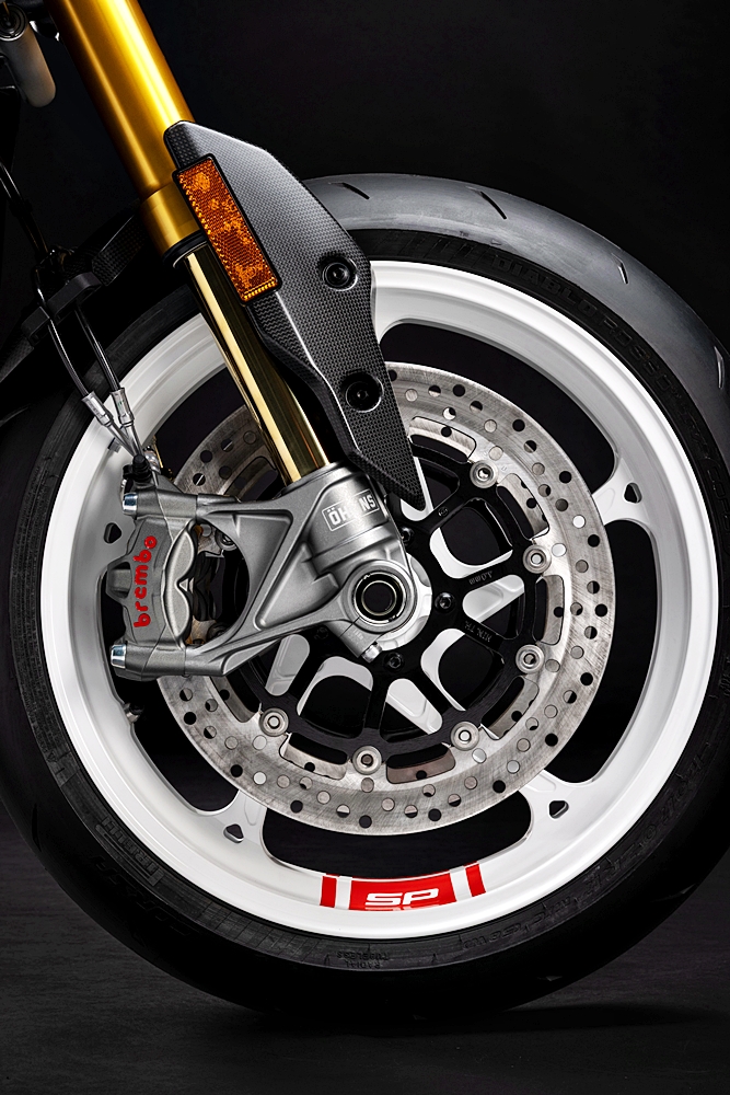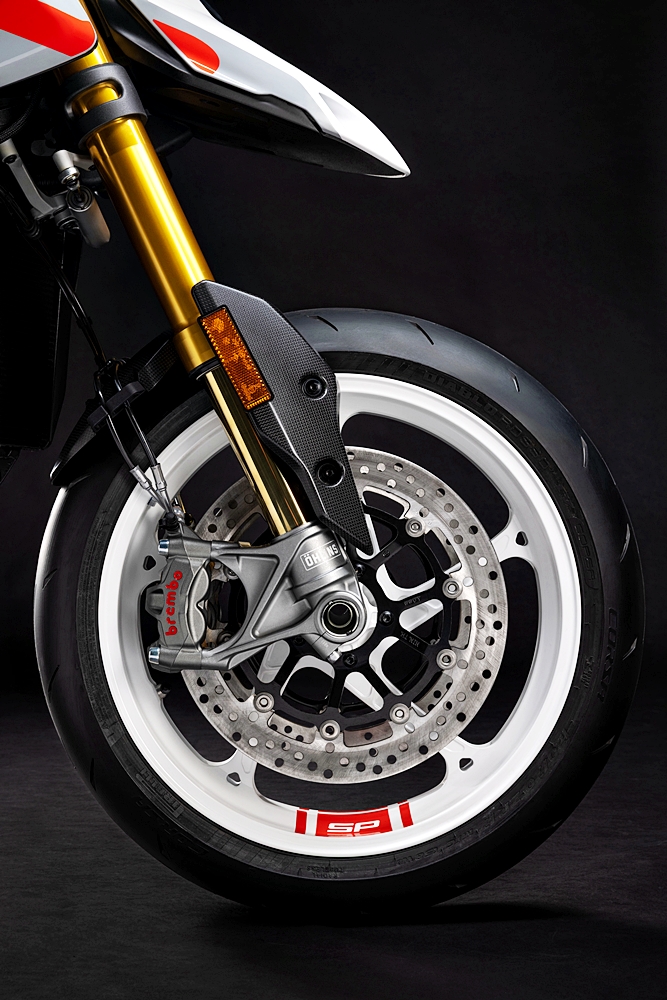 - Sistem suspensi fork terbalik (USD) Öhlins NIX30 48mm boleh laras penuh (depan), dan monoshock Öhlins STX46 boleh laras penuh (belakang)