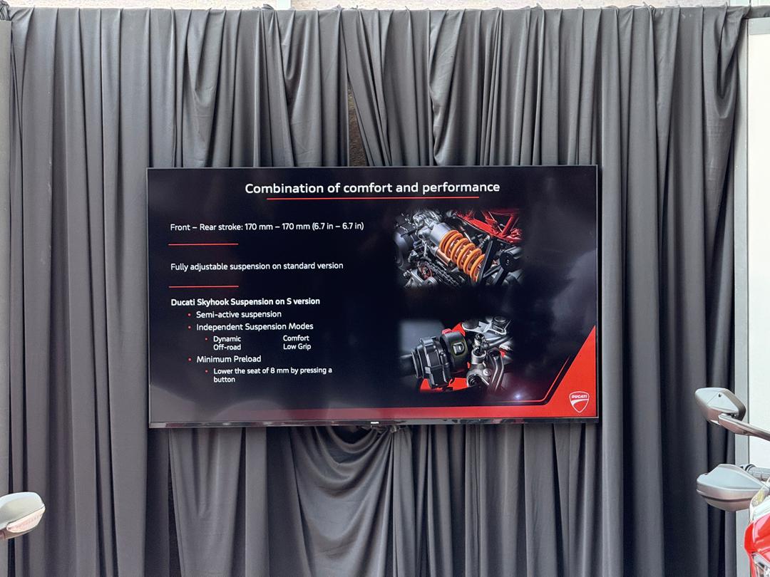 Model V2 S menerima tambahan suspensi Skyhook semi-aktif, Ducati Quick Shift (DQS), kawalan jelajah, dan sistem elektronik premium seperti ABS Belok, DTC, DWC, mod tunggang dan sambungan telefon pintar.