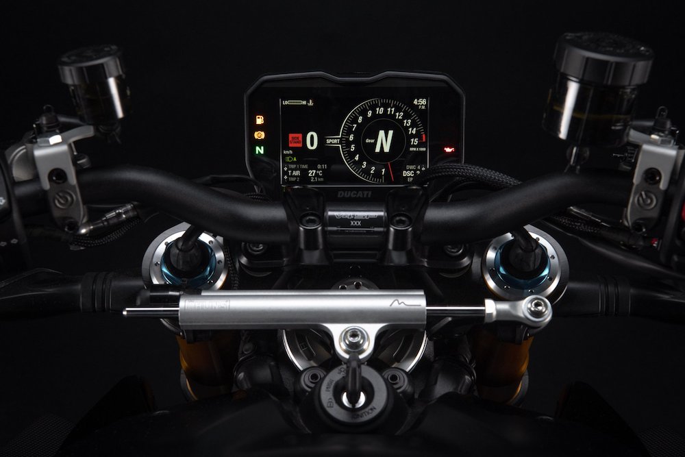 - Hadir dengan pilihan Mod Tunggangan, Mod Kuasa, Sistem Brek Anti-Kunci (ASB) Belokan, Kawalan Traksi Ducati, Kawalan Wheelie Ducati, Lampu Siang (DRL) dan lampu utama LED penuh.