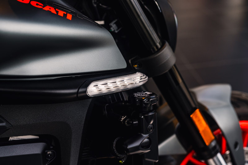 - Menggunakan sistem lampu LED, termasuk lampu siang (DRL) LED. Lampu signal belok diposisikan melintang pada sisi frem, di bawah tangki minyak.