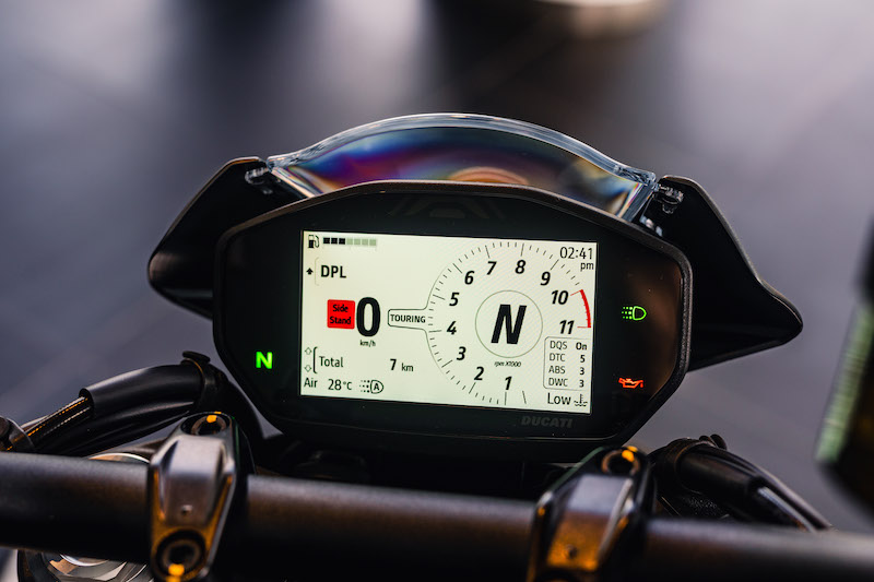 - Tetapan boleh ubah menerusi konsol kawalan pada bar hendal. Ada panel meter TFT 4.3 inci berwarna dengan konektiviti Ducati Multimedia System (DMS) untuk sambungan telefon secara Bluetooth.
