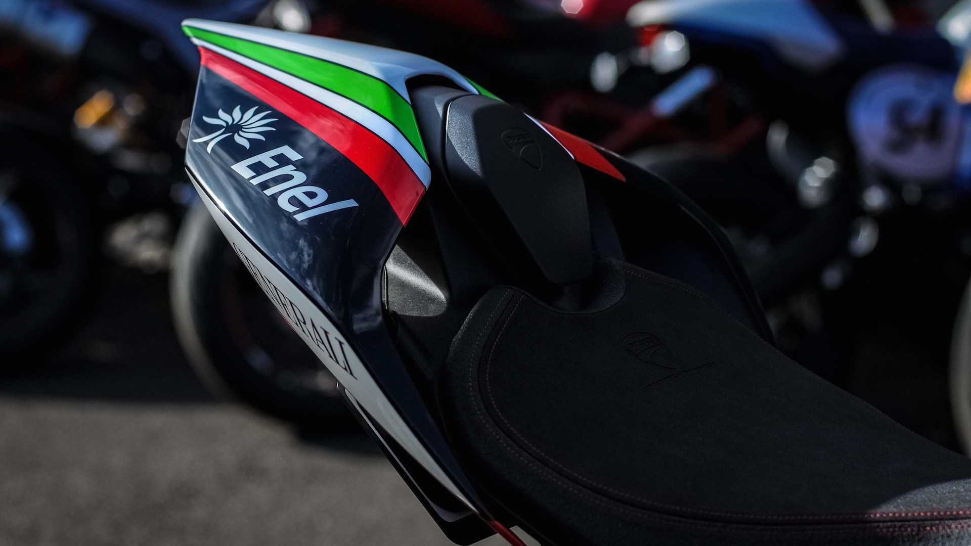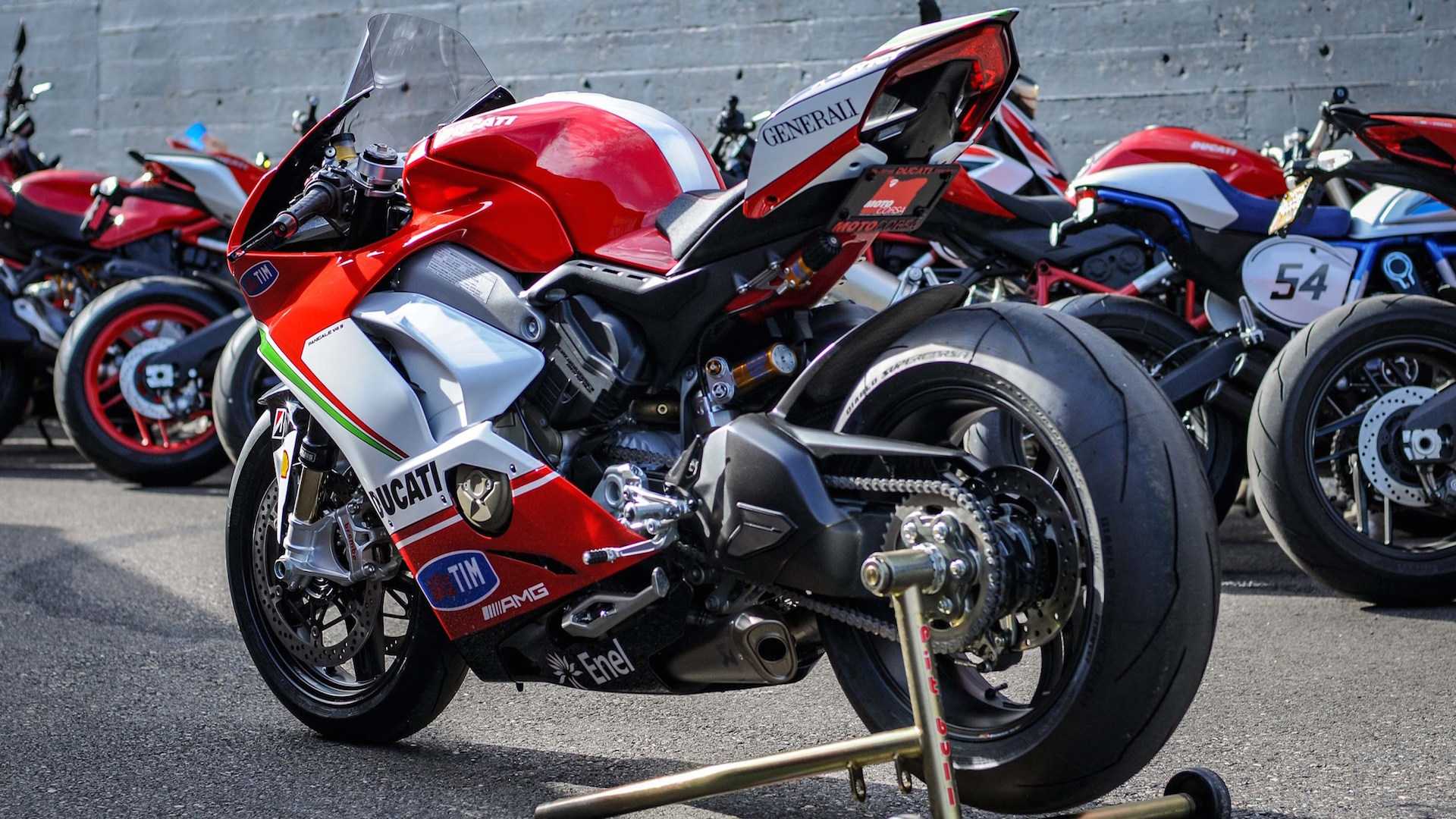 Suspensi standard digantikan dengan Öhlins spesifikasi tinggi, R/T untuk fork, dan monoshock TTX berserta damper stereng. Superbike itu turut menerima kit klac kering V4 R dan set rim gentian karbon Superleggera BST dengan tayar Pirelli Diablo Supercorsa untuk berat jentera lebih ringan, manakala hamburan kuasa dilepaskan ekzos titanium jenis slip-on daripada Akrapovic.
