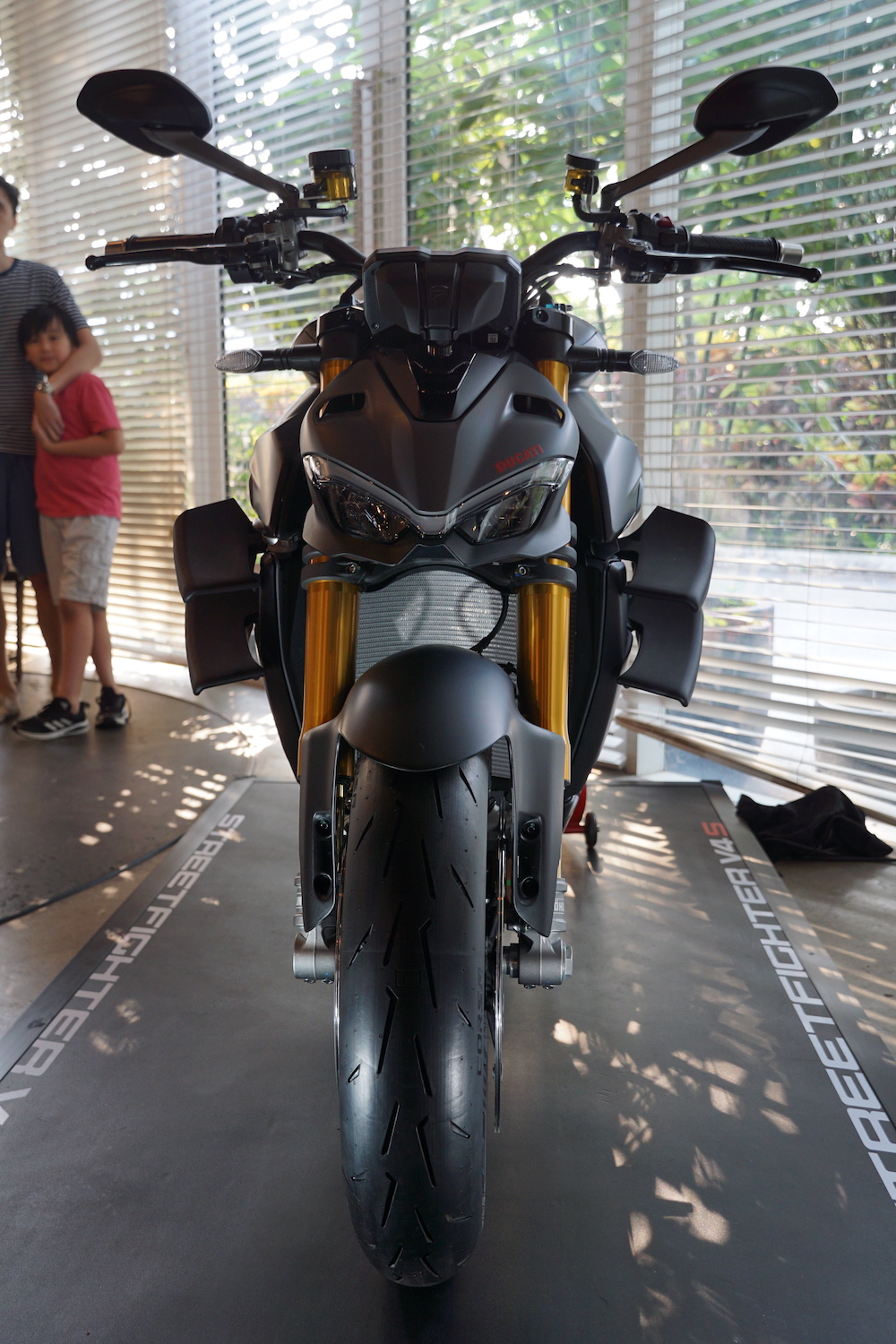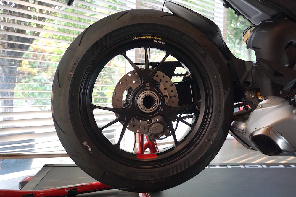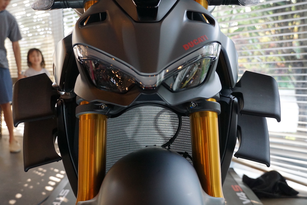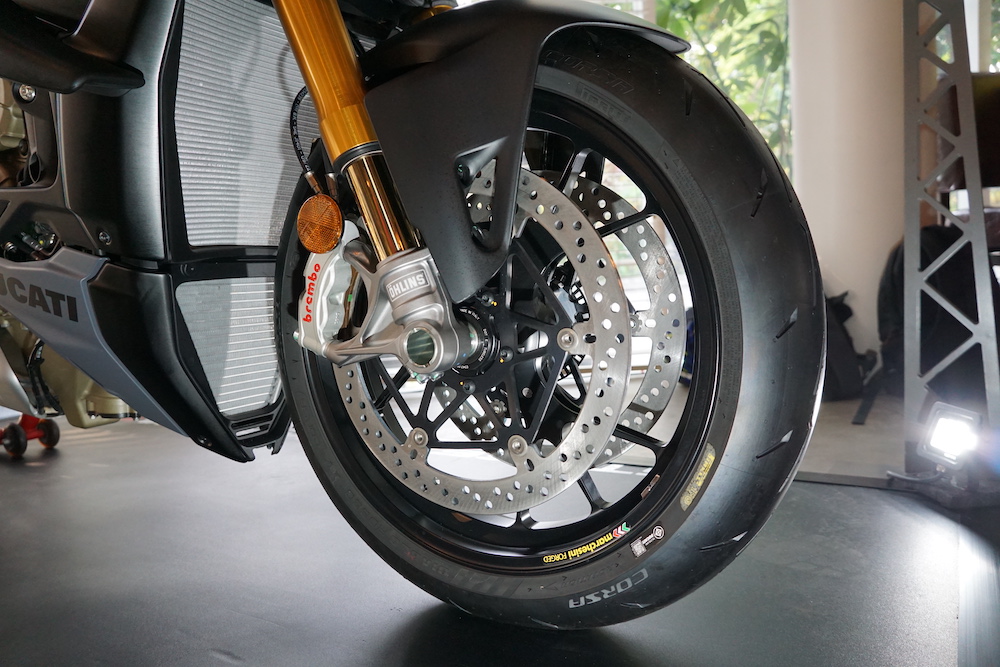 - Berat kasar 201.5kg. Dipasangkan dua pasang winglet pada sisi motosikal dengan bar hendal lebih tinggi, lebar berbanding Panigale V4.