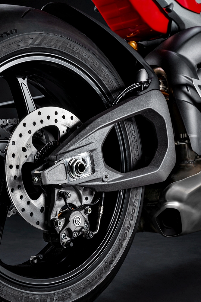 - Mengenai casis, frem depan lebih ringan 3.47kg berbanding 4.42kg, manakala penggunaan swingarm Ducati Hollow Symmetrical meningkatkan cengkaman ketika keluar dari selekoh dan keyakinan ketika memecut.