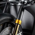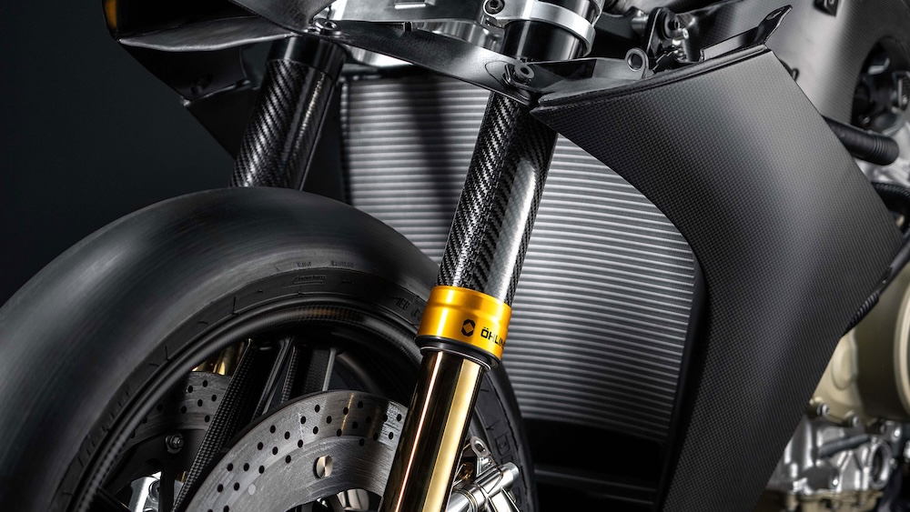Satu lagi teknologi pertama dunia ialah penggunaan fork Öhlins NPX 25/30 Carbon pressurized dengan sleeve gentian karbon. Fork ini bukan sahaja lebih ringan berbanding Panigale V4 R, malah menawarkan rasa front-end yang lebih tajam ketika membrek dan masuk selekoh – teknologi yang jelas diinspirasikan daripada MotoGP.