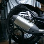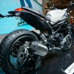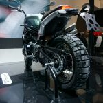 Suspensi belakang disokong swingarm sebelah dengan absorber pra-beban boleh laras dan damper lantunan dengan travel 140mm. Posisi pelana juga sedikit tinggi 818mm berbanding versi jalanan (800mm)