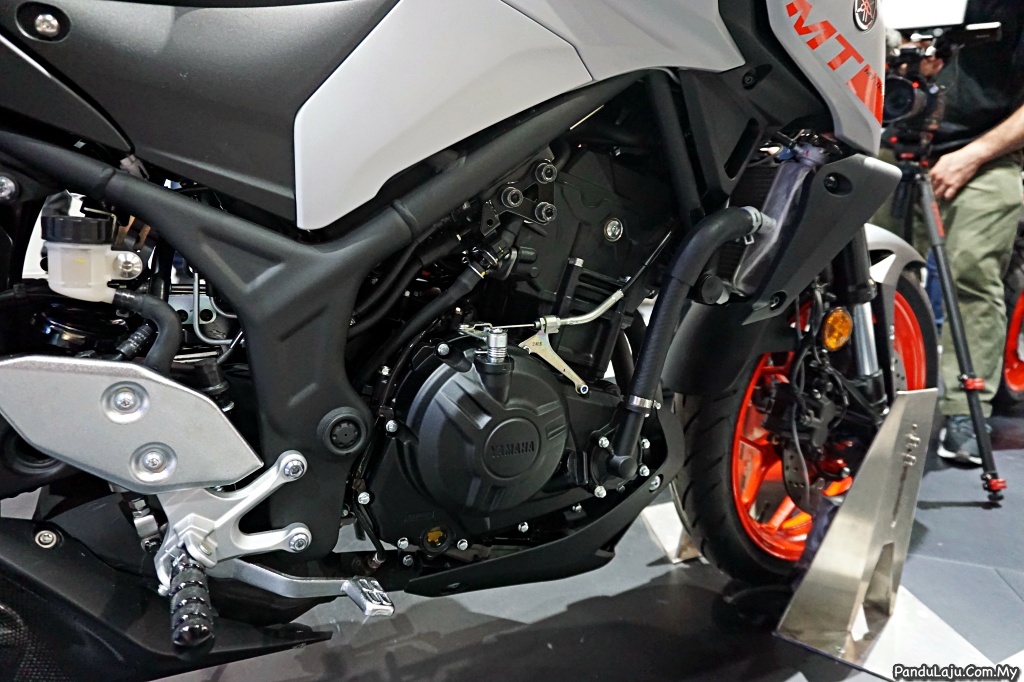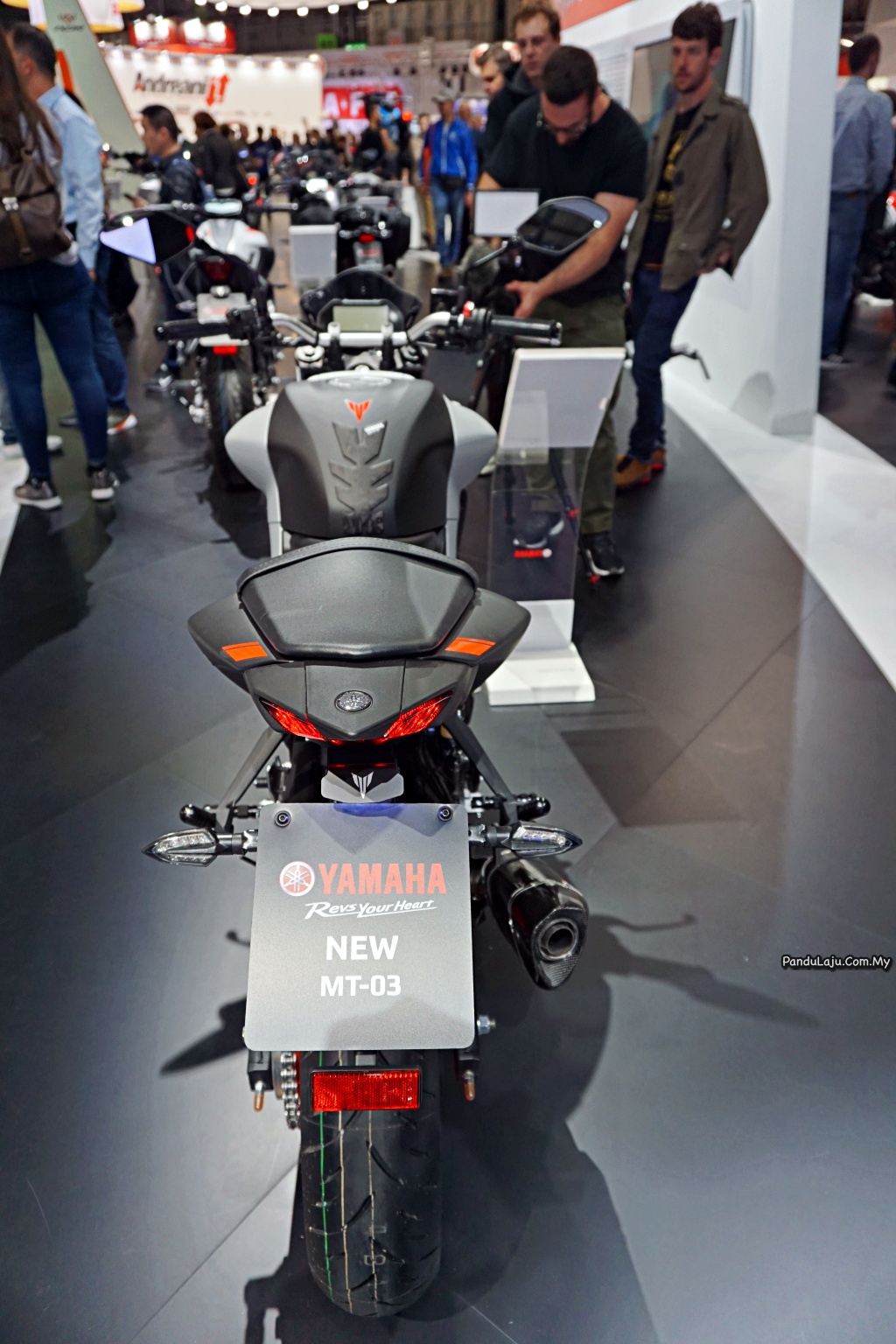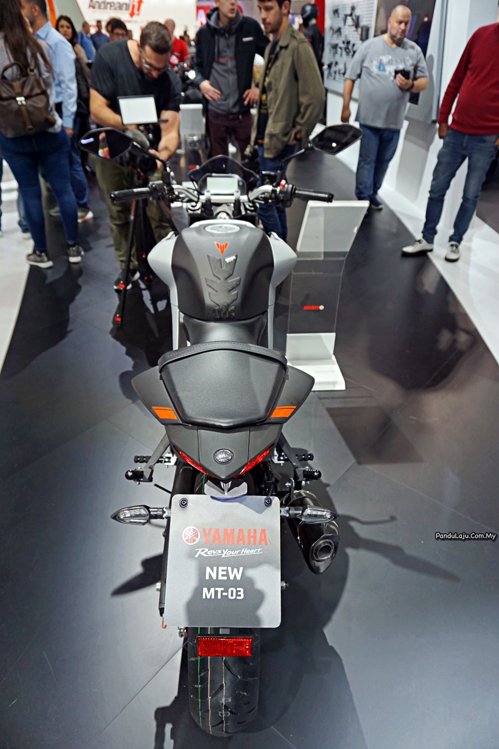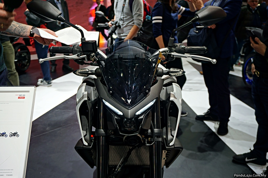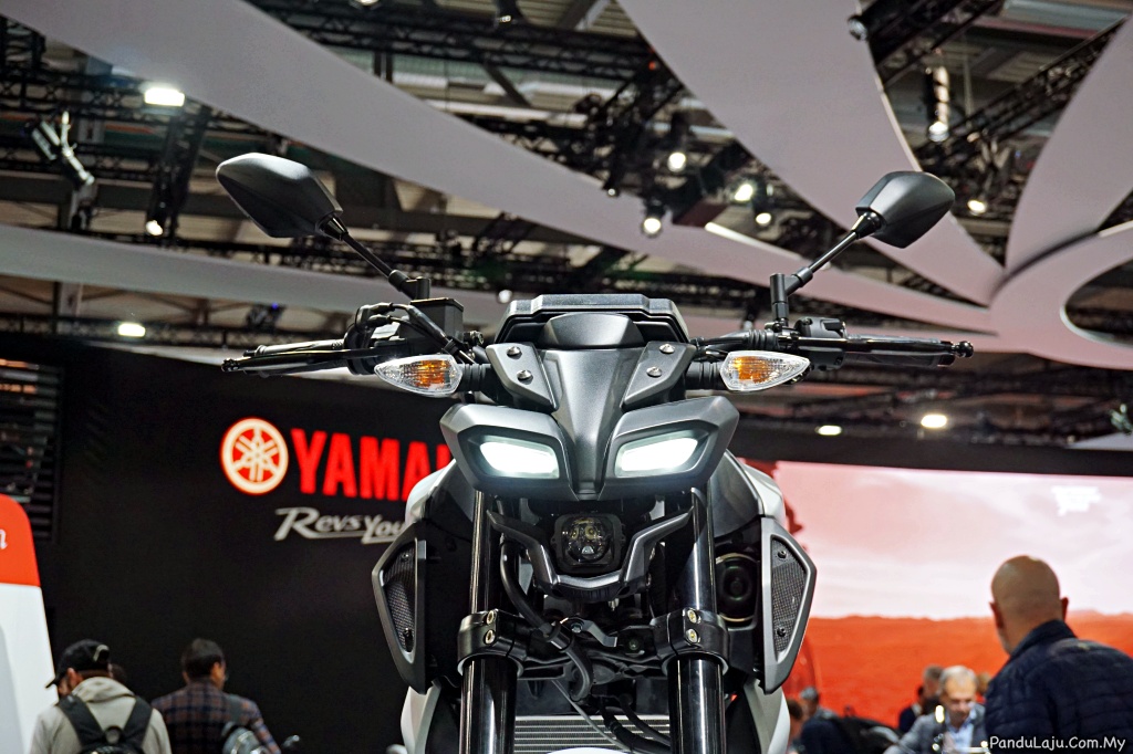 Abangnya, MT-03 turut dipamerkan di reruai Yamaha selepas pra-pelancaran model tersebut, Oktober lalu menerusi siaran video acah. Enjin 321cc berkenaan menghasilkan kuasa 41.4hp @10,750rpm dan tork 29.6Nm @ 9,000rpm, manakala hantaran kuasa ke roda belakang disalurkan menerusi transmisi klac manual 6-kelajuan.