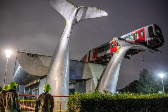 Sebuah tren merempuh dan melepasi pengadang rel di Stesen Metro De Akkers, bandar Spijkenisse tetapi terselamat daripada terjatuh ke bawah selepas berhenti betul-betul atas arca ekor paus gergasi.