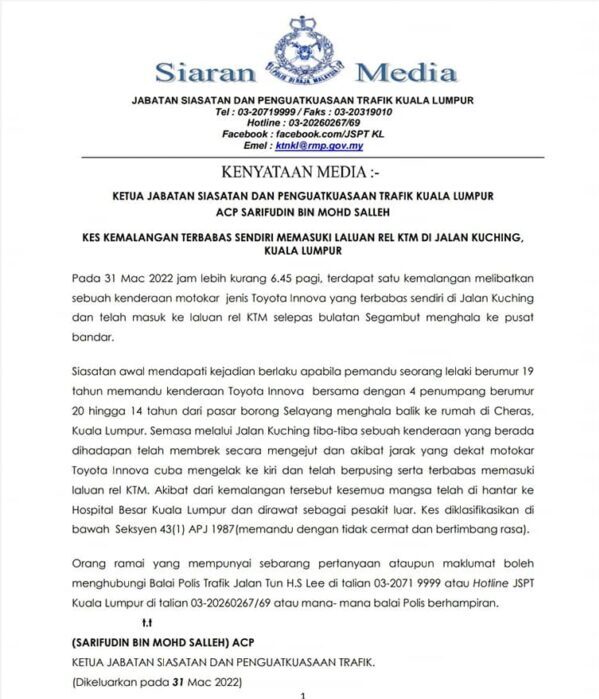 Menurut polis, insiden itu berlaku apabila sebuah kenderaan di depan membrek mengejut dan disebabkan jarak terlalu dekat, mangsa bertindak mengelak ke kiri dan berpusing sebelum terbabas memasuki laluan rel KTMB.