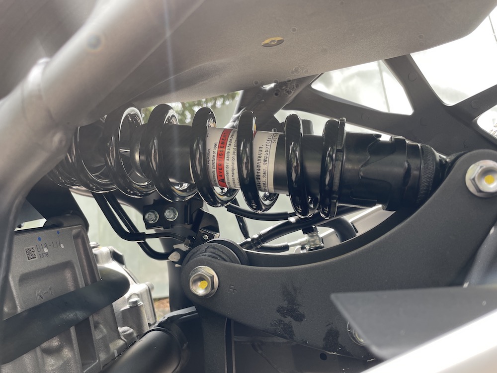 - Fork terbalik (USD) Showa SFF-BP boleh laras di depan, dan monoshock horizontal back-link boleh laras prabeban di belakang.