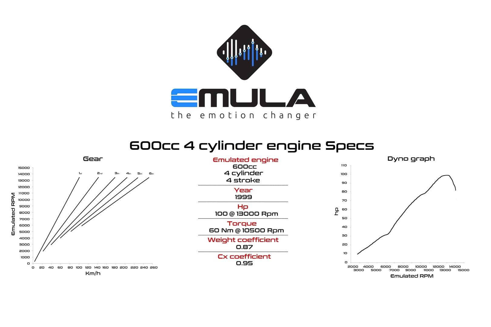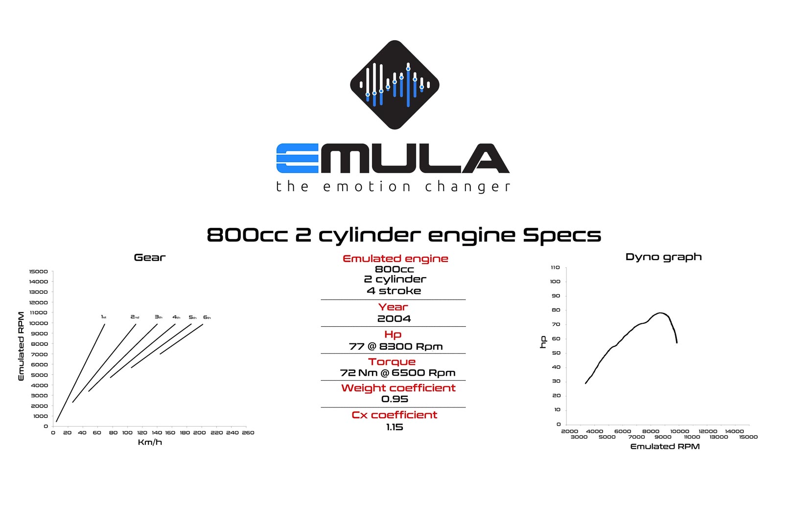 Selain bunyi ekzos, Emula Concept turut menyediakan ciri klac fauks yang membolehkan penunggang gear mengikut pengehad rev (rpm) sebelum menukar gear jika mahu melakukkannya.
