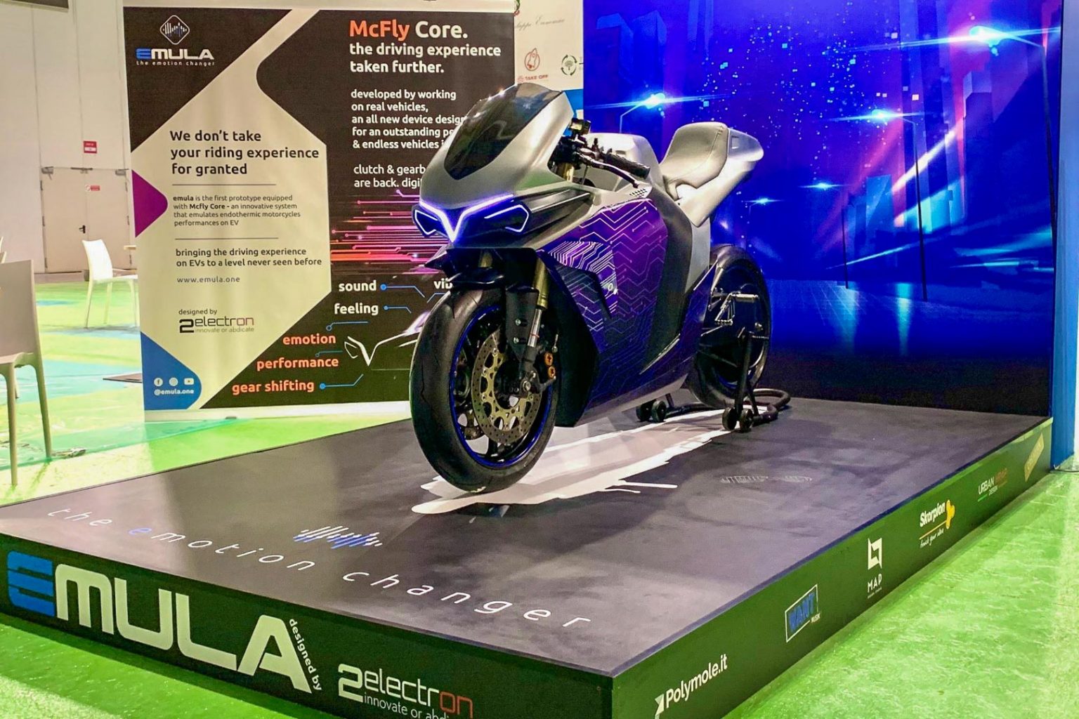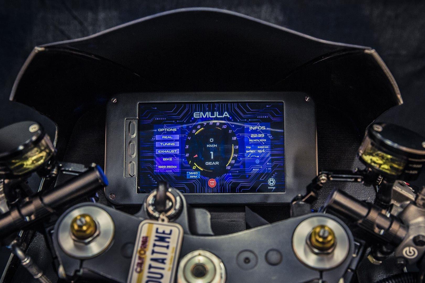 Bunyi bising 2-lejang mungkin jadi isu, tetapi Emula sudah pun memikirkan kontroversi itu. Jadi runut bunyi direka untuk boleh dihubungkan ke pembesar suara helmet menerusi sambungan Bluetooth. Sekarang penunggang tidak perlu lagi risau pasal jiran tetangga yang mungkin geram dengan bunyi bising motosikal anda.