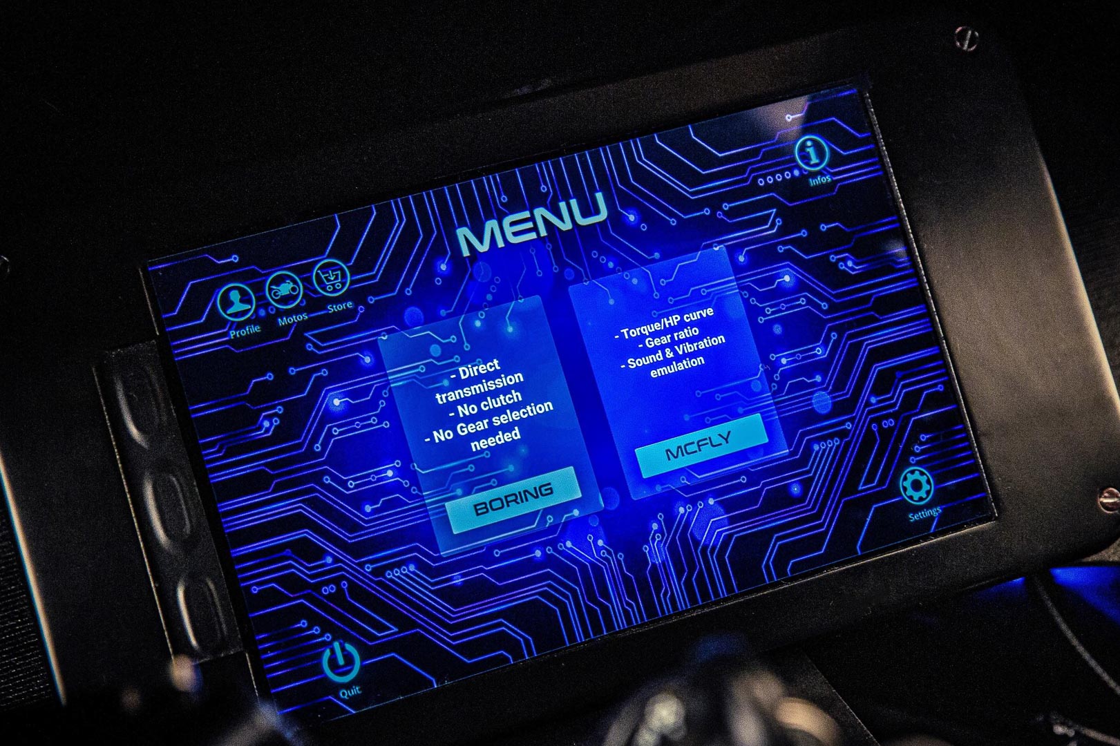 Menerusi Emula, penunggang boleh memilih tiga nota enjin berbeza yang dipanggil Pengawal McFly dan akan menderum seiring perahan terotel. Tiga mod bunyi ekzos ditawarkan itu ialah berasaskan: