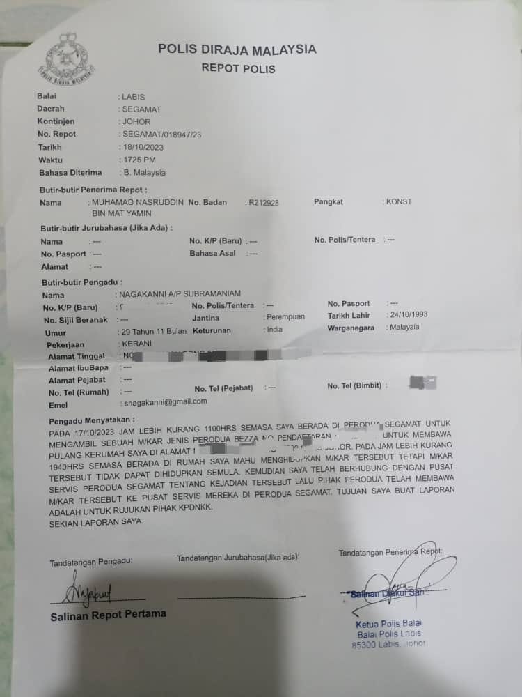 Lebih menyedihkan, Nagakanni Subramaniam terpaksa membayar pinjaman bulanan Perodua Bezza baharunya itu sebanyak RM537, sedangkan sedan tersebut masih tersadai di Pusat Servis.