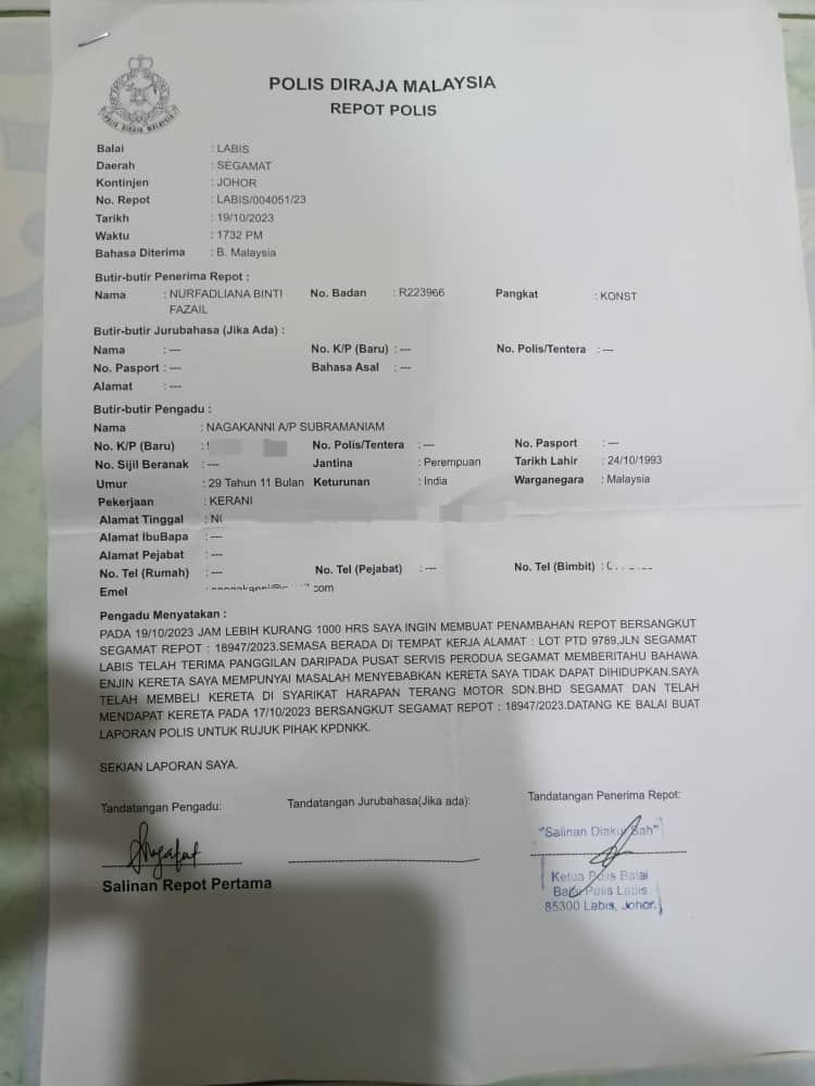 Berkongsi kisah di laman Facebook, Nagakanni mendakwa membeli kereta itu dari sebuah bilik pameran Perodua di Segamat, jam 11 pagi, pada 17 Oktober lalu.