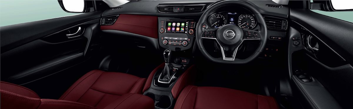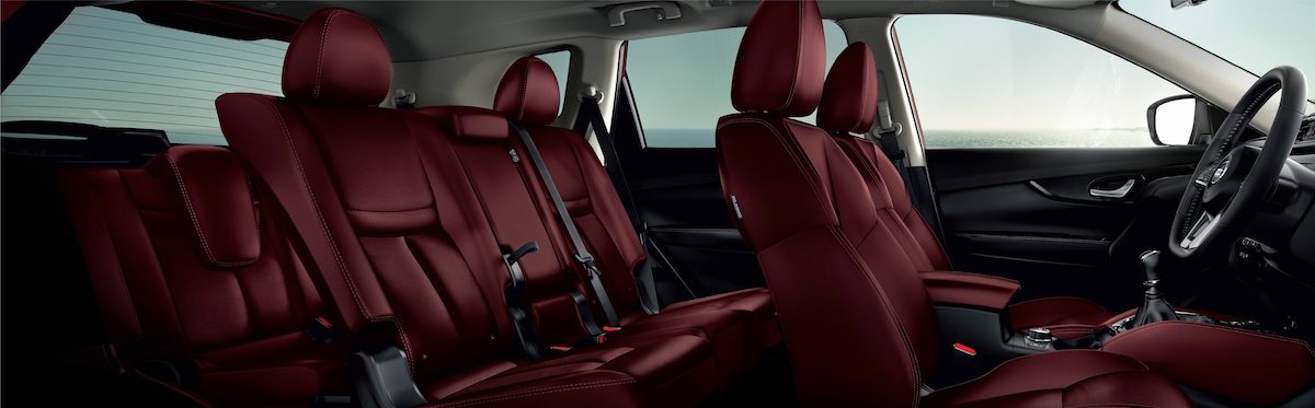 Ruang kabin X-Trail Tuned by IMPUL mendapat kemasan baharu dengan balutan material Nappa marun pada kerusi, material sintetik pada papan pemuka, pelindung lutut dan perehat tangan.