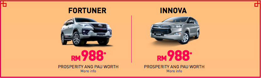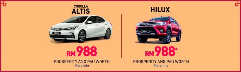 Selain angpau, pengedar rasmi jenama Toyota di Malaysia itu turut berbesar hati memberikan aksesori dan servis penyenggaraan percuma untuk model-model terpilih seperti berikut: