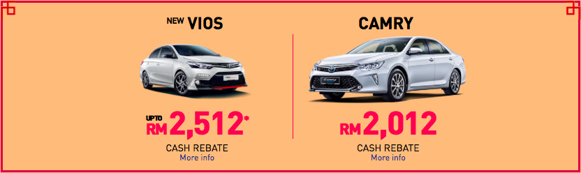 Tidak hanya angpau, UMW Toyota Motor turut menawarkan rebat dan aksesori istimewa untuk model terpilih. Pembeli Vios akan menerima rebat hingga RM2,512. Model sedan tersebut turut dipasangkan antena sirip yu, monitor imej panorama (pertama dalam segmen-B), perakam video digital (DVR), dan sistem DVD-AVN bersama paparan imej undur dan garis panduan.