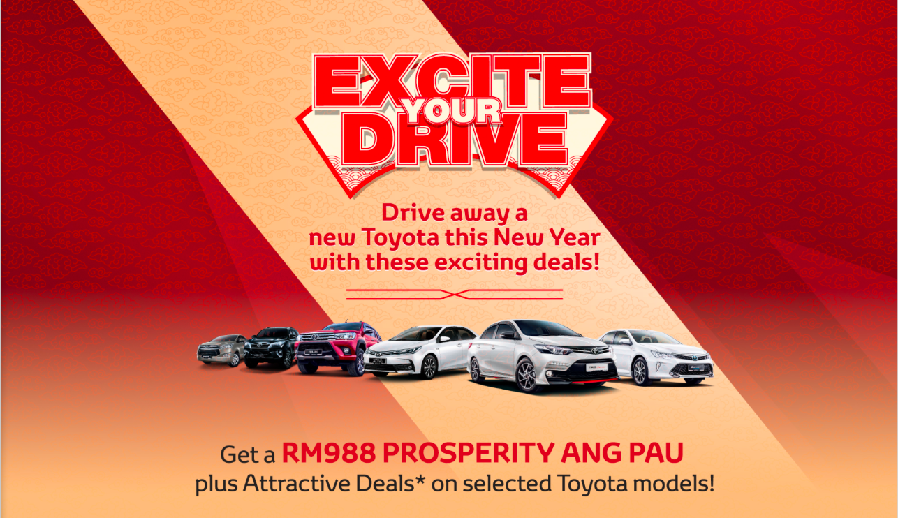MAHU bawa pulang model Toyota baharu? Anda hanya perlu ikuti kempen ‘Excite Your Drive’ (Seronokkan Pemanduan Anda) yang dianjurkan UMW Toyota Motor sempena Tahun Baru dan Tahun Baru Cina ini. Lebih menarik, pelanggan yang membeli Vios baharu, Camry (semua varian), Corolla Altis, Hilux, Fortuner dan Innova bakal menerima angpau ‘kemakmuran’ bernilai RM988.