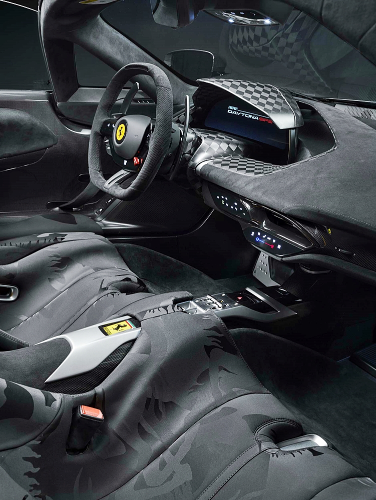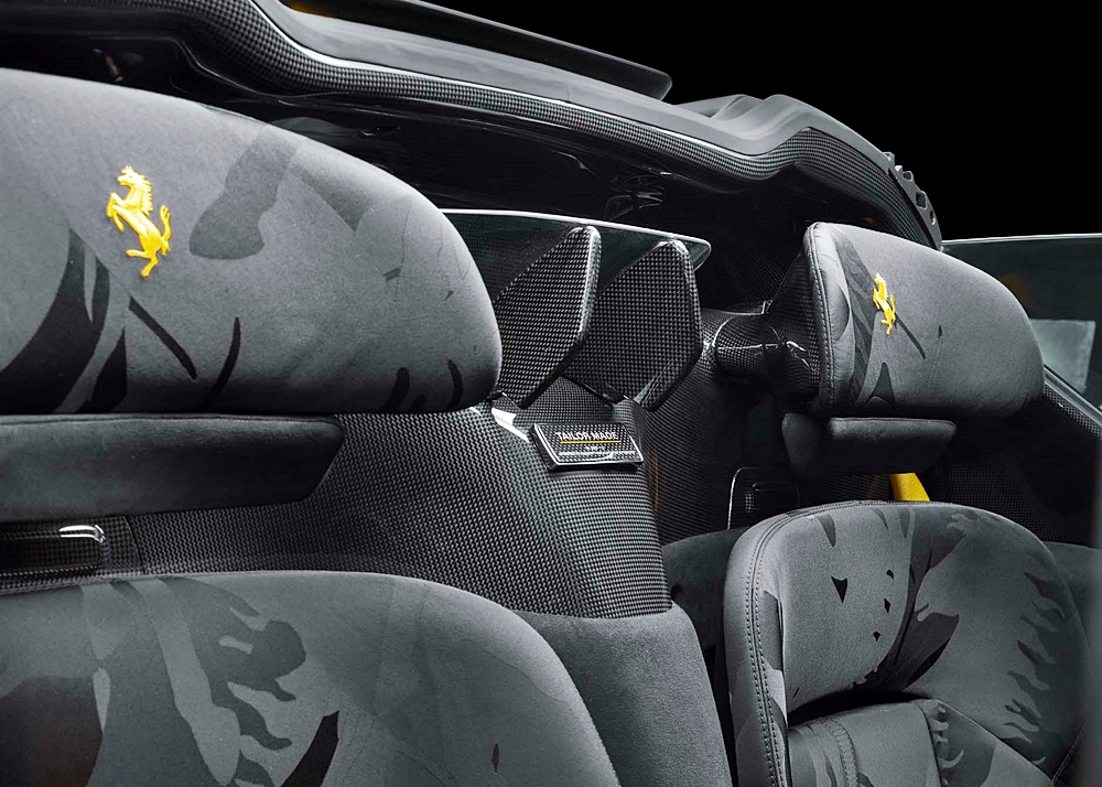 Papan pemuka dan tiang stereng dibuat daripada sejenis gentian karbon yang sering digunakan dalam jentera Formula 1, yang mengukuhkan kaitan model ini dengan warisan perlumbaan Ferrari.