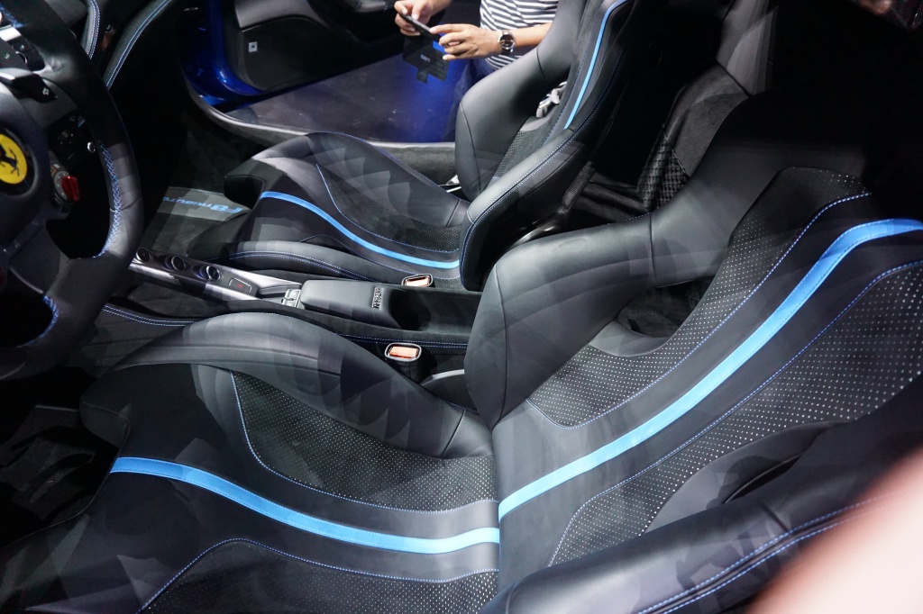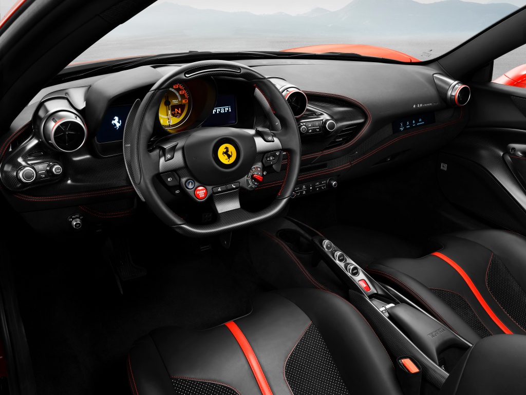 Ruang kabin pula mengekalkan sentuhan klasik yang sinonim dengan Ferrari menerusi kokpit fokus pemandu. Bahagian papan pemuka, panel pintu dan lohong tengah diberikan rekaan baharu. Human Machine Interface (HMI) baru dengan reka letak tombol kawalan, ventilator penyaman udara dan skrin sentuh 7 inci penumpang memberikan ambien kabin lebih segar.