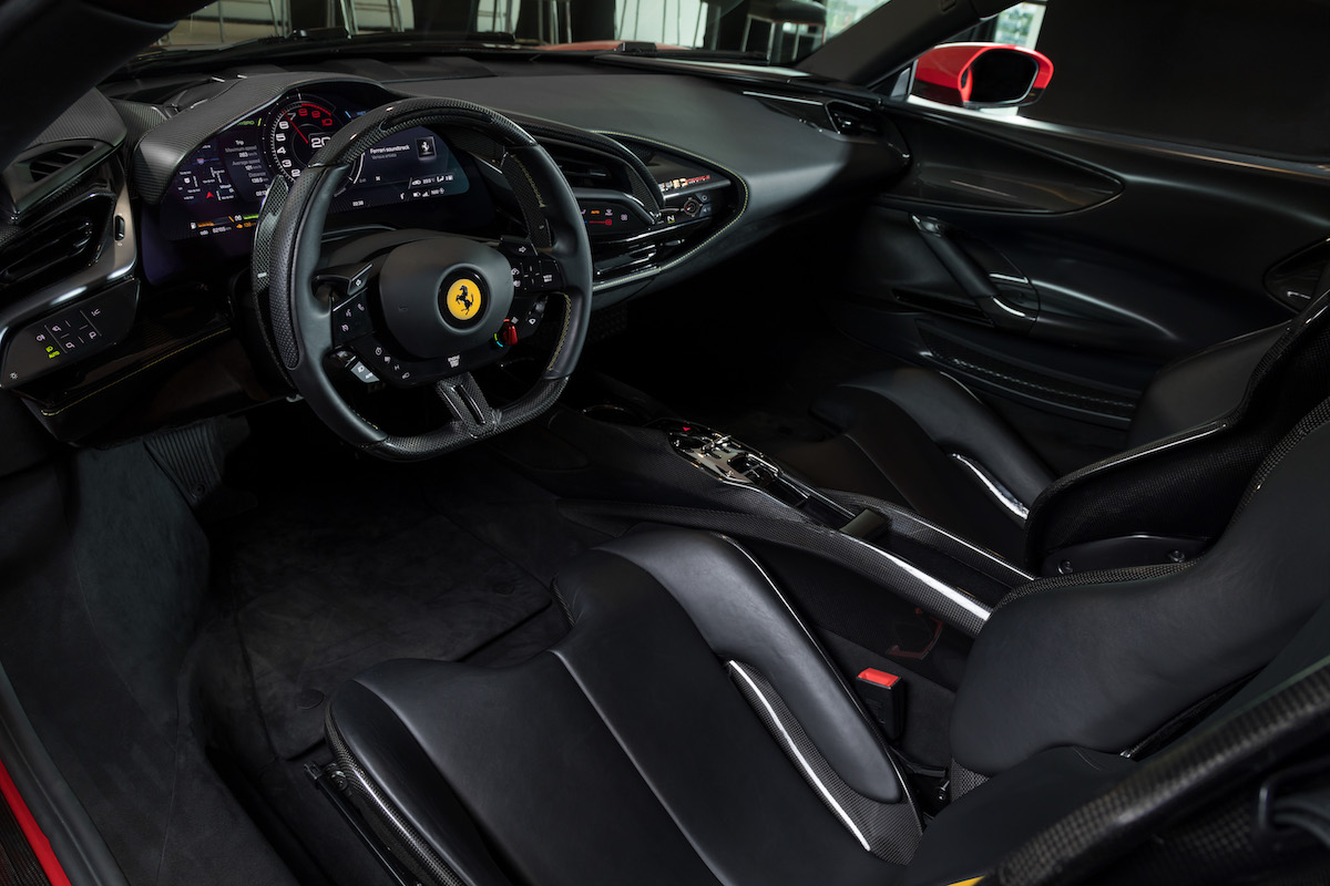 Stereng juga baharu, siap dengan pad sentuh dengan kawalan haptik dan sistem navigasi baharu dan paparan dongak (HUD). Juga baharu ialah kunci kereta dengan nama model dan plat logam perisai Ferrari.