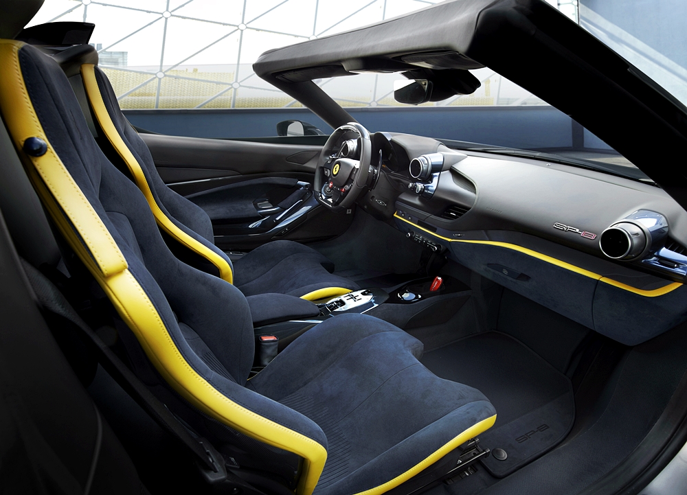 Bahagian dalaman diubah dengan konsol tengah menempatkan butang kawalan Formula Satu (F1) ala model Ferrari lama. Kerusi dibalut material Alcantara Navy Blue dan fabrik corak gradien.