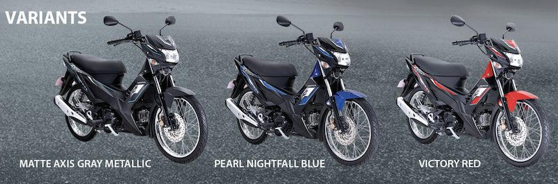 Ada tiga warna pilihan ditawarkan, iaitu Matte Axis Grey Metallic (kelabu gelap), Pearl Nightfall Blue (biru hitam) dan Victory Red (merah hitam).