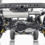 - Bahagian belakang jenis gandar solid dengan koil spring dan lima pautan (links) untuk kekukuhan dan kawalan off-road.
