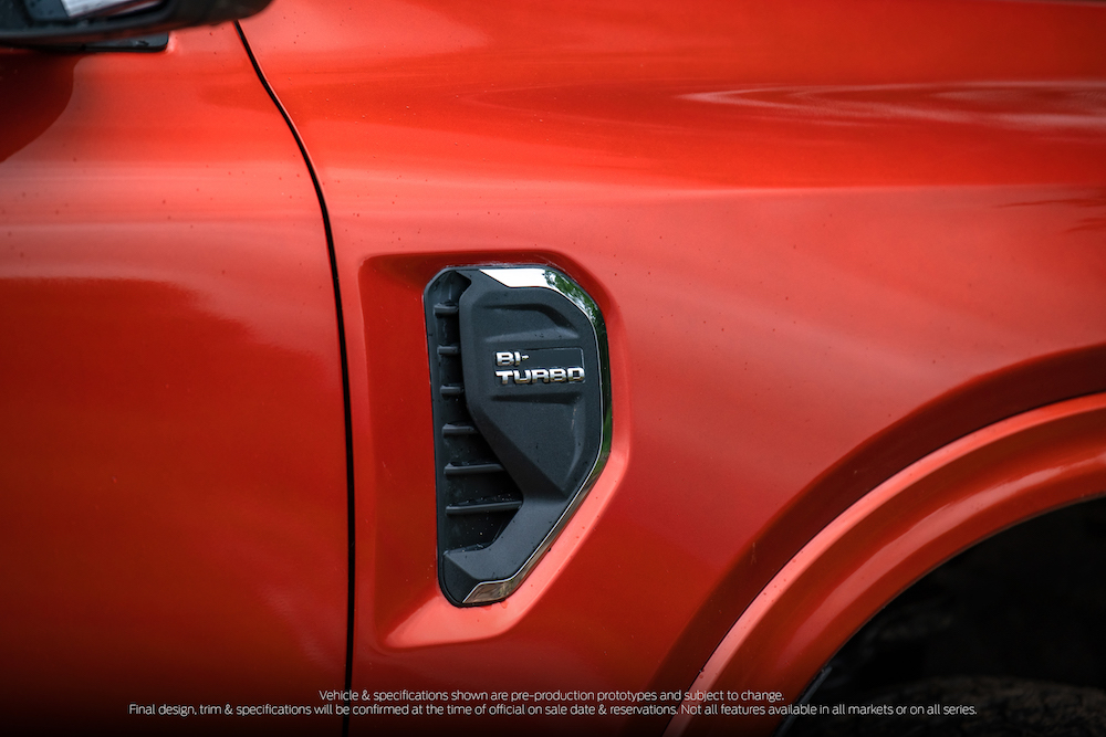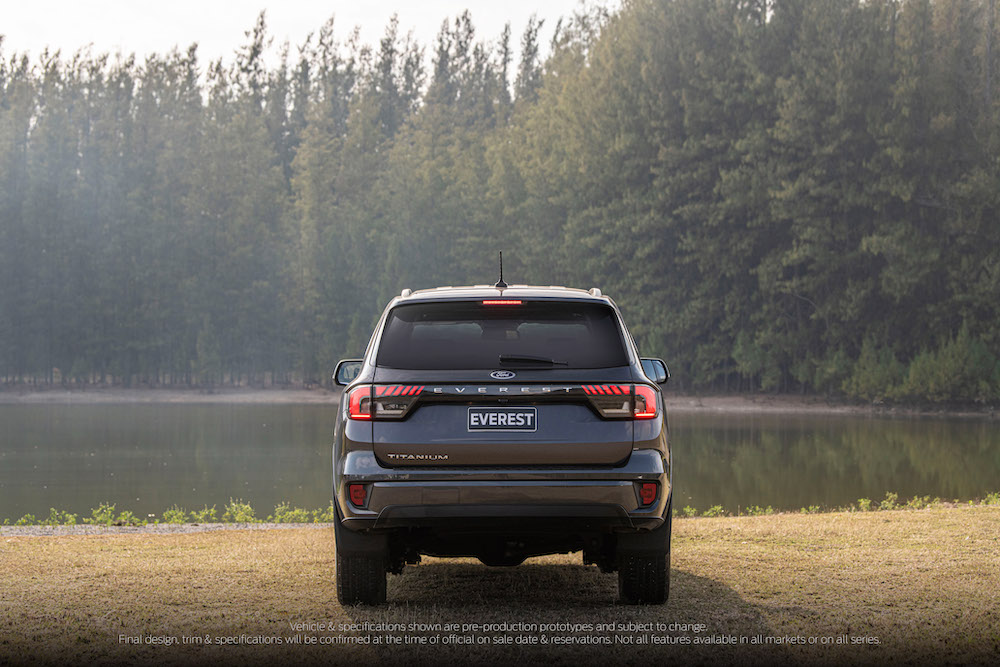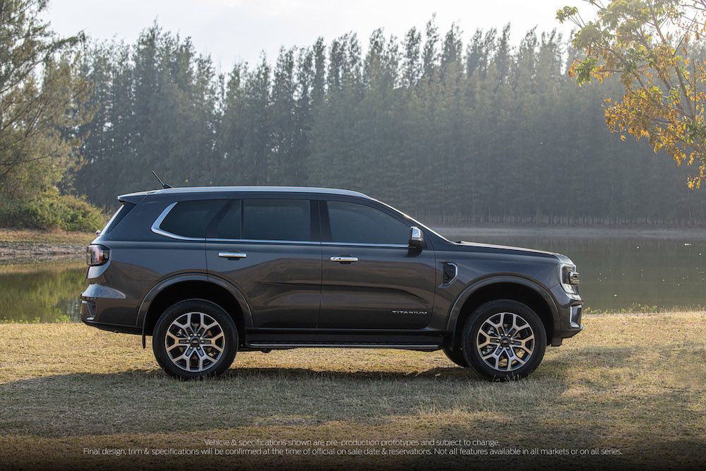 - Dari sisi, imej SUV diserlahkan menerusi garis badan menonjol dari depan hingga belakang. Jejak trek dan lekuk roda lebih besar menambah baik imej Everest (2022).