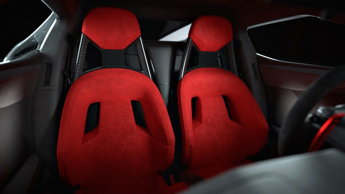 Bahagian dalaman menggunakan kemasan balutan sued Alcantara hitam pada panel meter, pelapik bumbung dan stereng. Pedal syif berwarna dan ruang dalaman meriah dengan kerusi Alcantara merah .