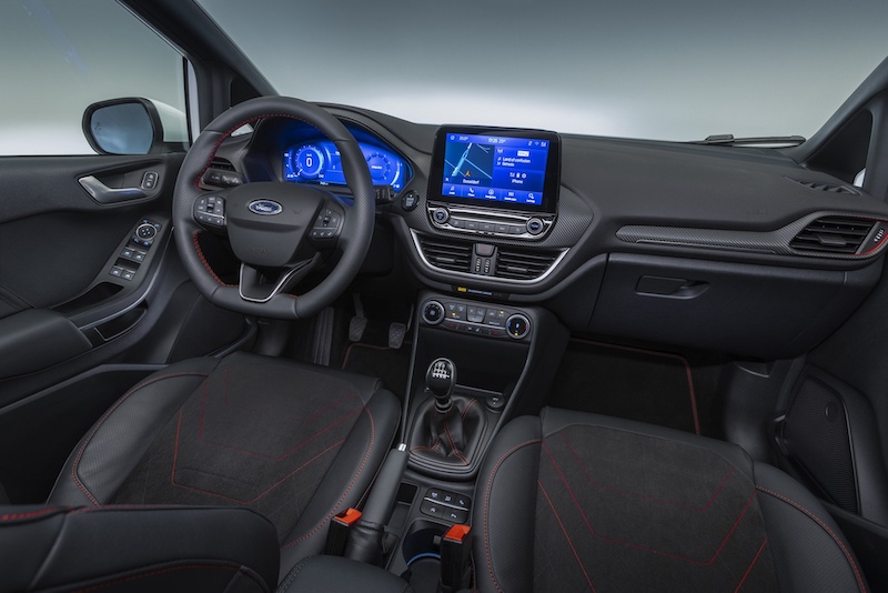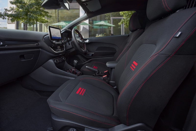- Bahagian kabin menggunakan kerusi sport Fiesta ST yang dibalut material Sensico dan sulaman benang merah. Tambahan lain ialah stereng sport, lencana ST dan kemasan kabin efek gentian karbon.
