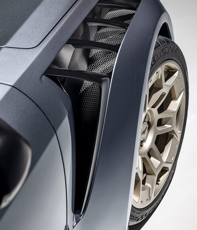 Tayar lebar itu dipasang pada rim aluminium tempa 20 inci atau rim pilihan magnesium tempa. Di sebalik roda, brek karbon seramik Brembo memainkan peranan optimum untuk penyingkiran haba. Haba brek belakang diuruskan saluran penyejukan yang dipasang pada bawah suspensi belakang.